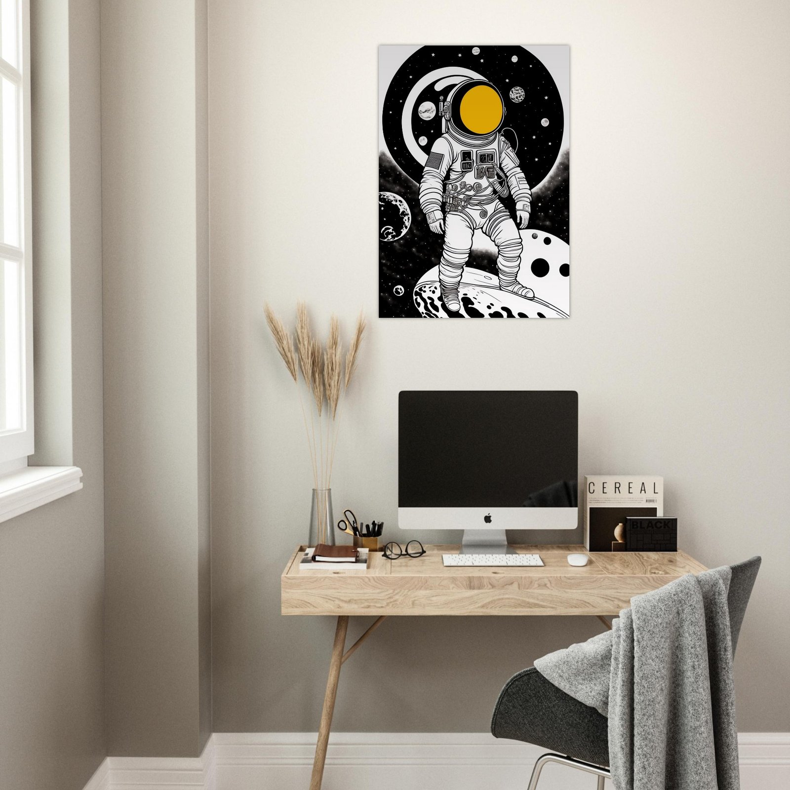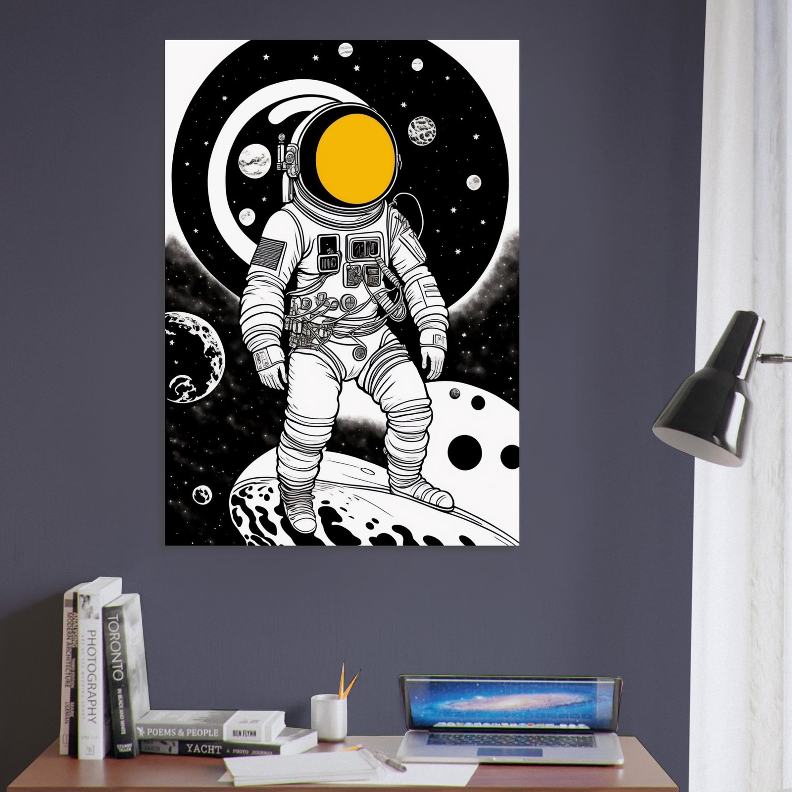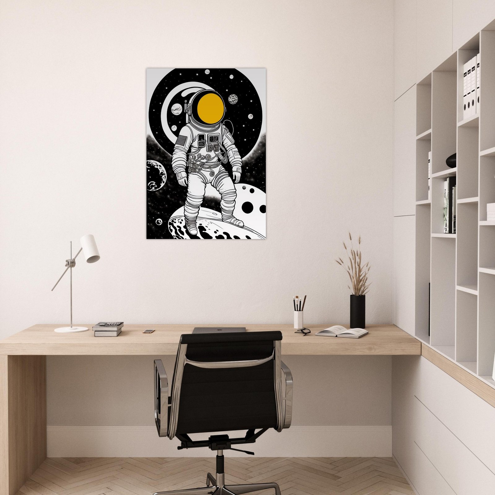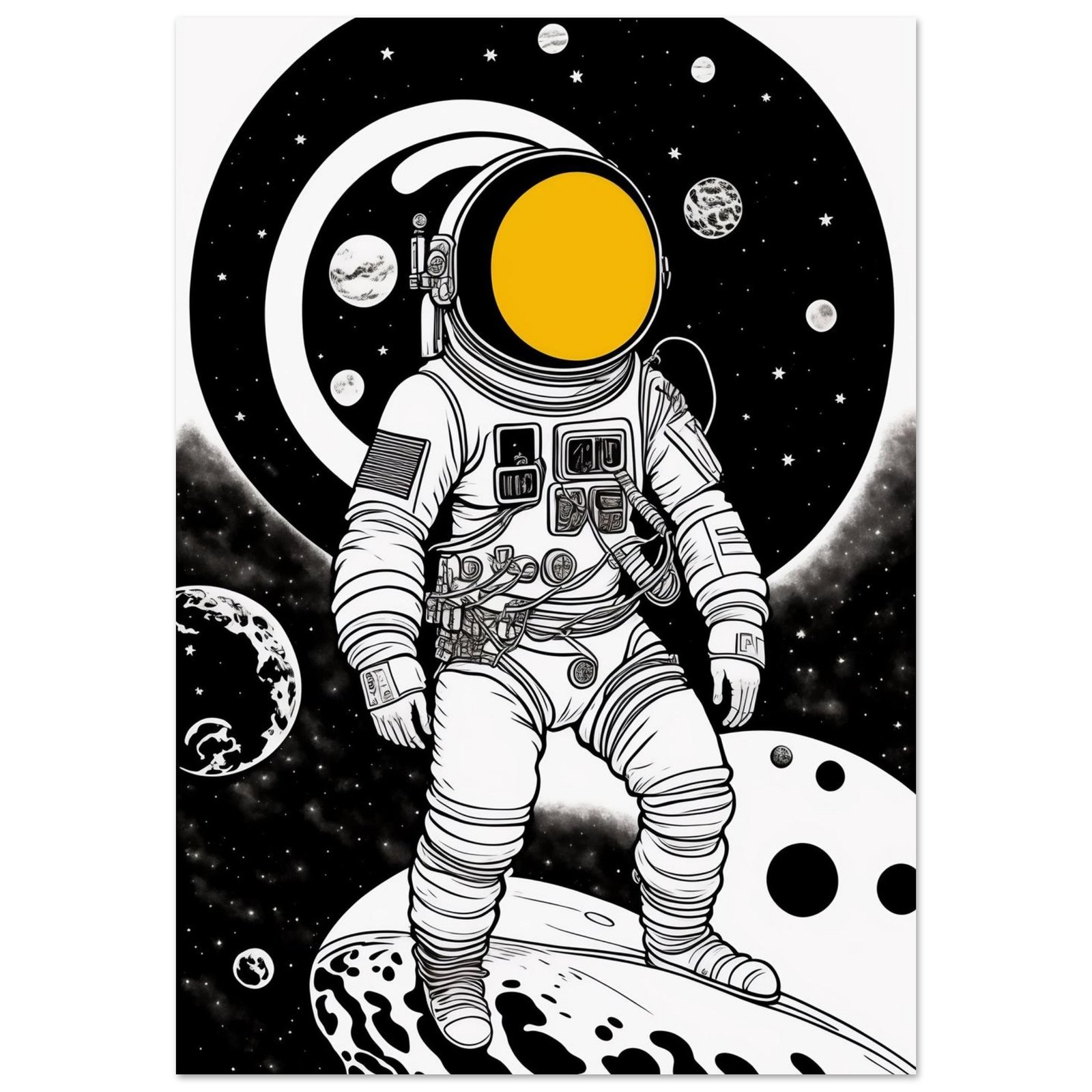 Kosmos Astronauta nigdy nie był tak blisko. Ten plakat przyciąga wzrok od pierwszej sekundy — intensywny żółty kontrastuje z głęboką czernią niczym portal otwierający drogę do przyszłości.