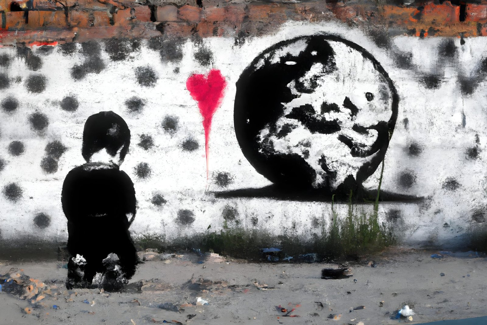 Poruszający mural w stylu Banksy’ego: dziecko klęczące przed Ziemią i symboliczne czerwone serce, które wygląda jak ostatni oddech nadziei. Minimalistyczny, a jednocześnie niezwykle emocjonalny projekt, idealny dla osób ceniących sztukę z przekazem — o świecie, odpowiedzialności i kruchości przyszłości.