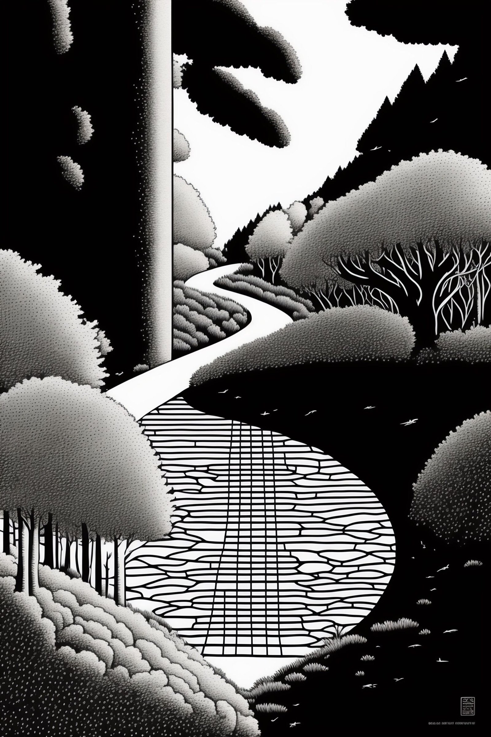 Plakat cyfrowy Pen & Ink – Czarny Las pokazuje spokojny krajobraz zamknięty w wysmakowanej czerni i szarościach. Punktowe cieniowanie i geometryczny rytm natury tworzą atmosferę harmonii. Świetny do sypialni, salonu lub przestrzeni medytacyjnych.