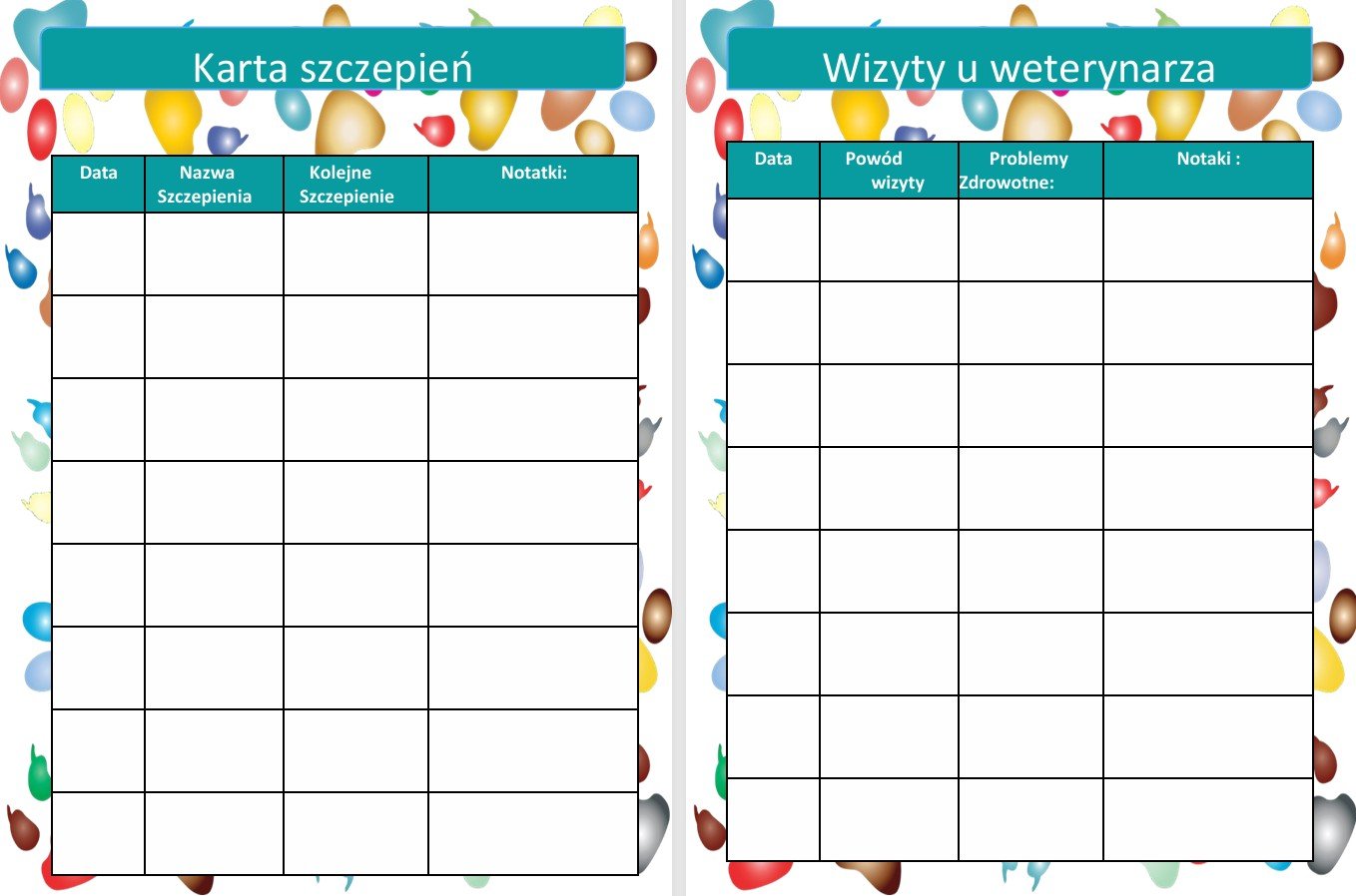 Karta zdrowia – miejsce na wpisanie alergii, leków, notatek o żywieniu oraz dane weterynarza