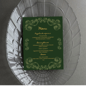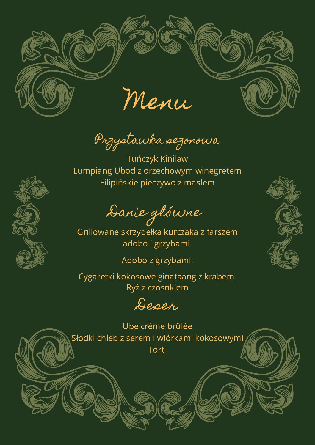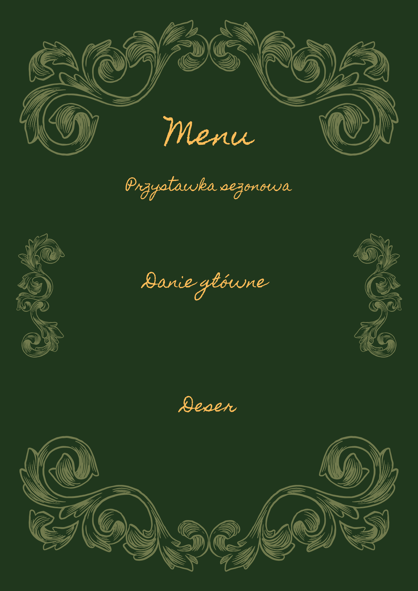 Profesjonalnie zaprojektowany szablon menu, który pozwoli Ci szybko stworzyć estetyczne i czytelne menu dopasowane do charakteru Twojego lokalu. Klasyczna kompozycja, dekoracyjne ornamenty oraz elegancka typografia sprawiają, że projekt wygląda prestiżowo i ponadczasowo.