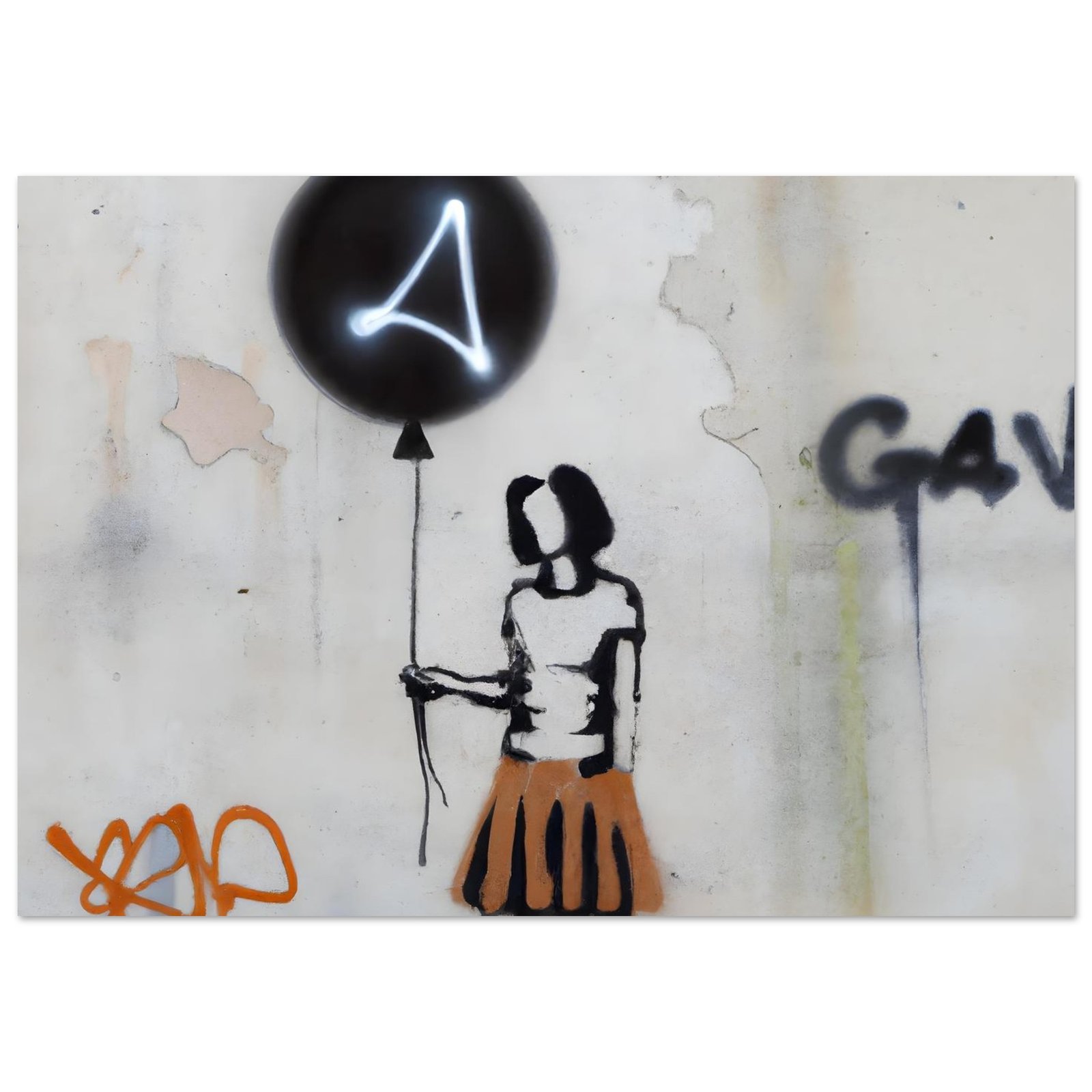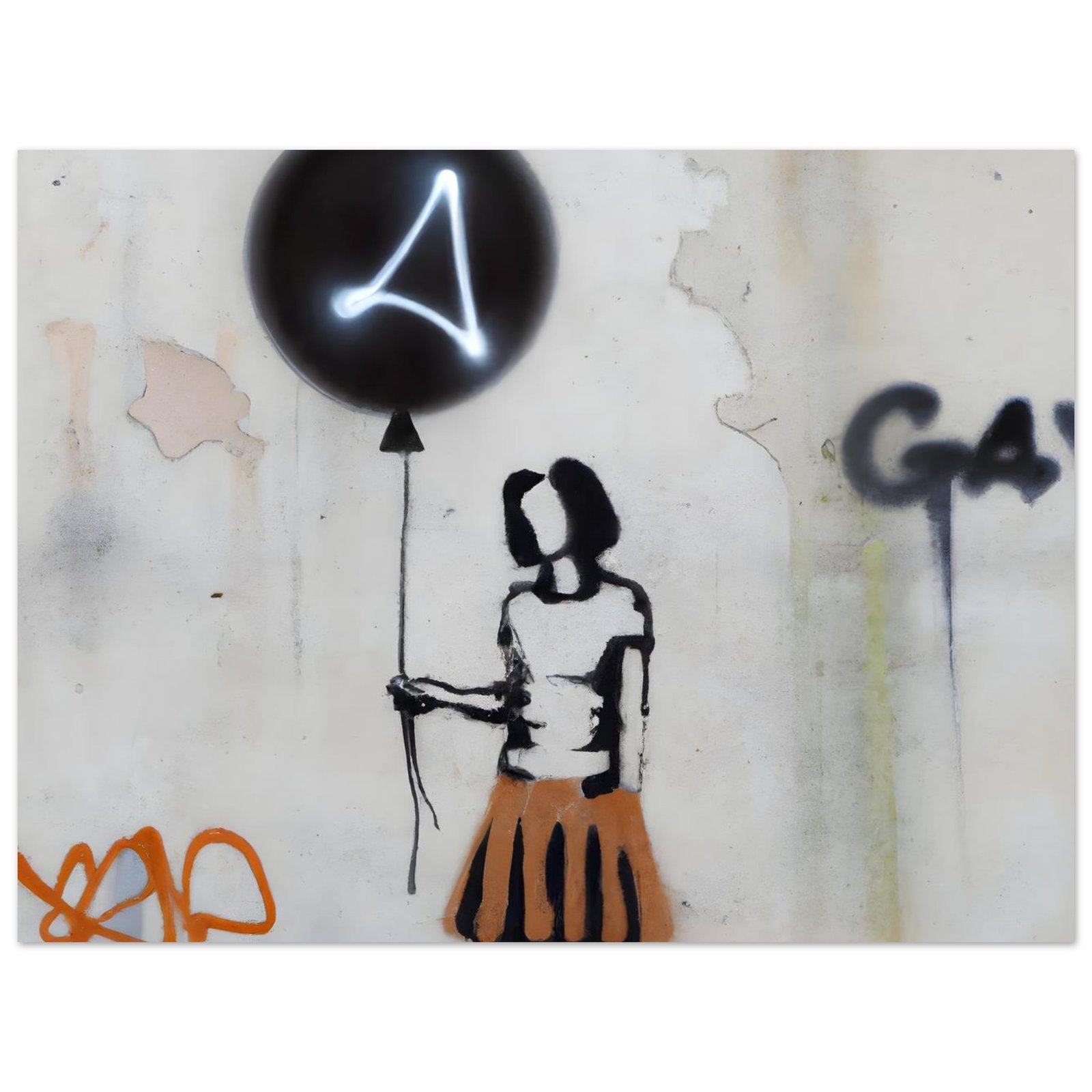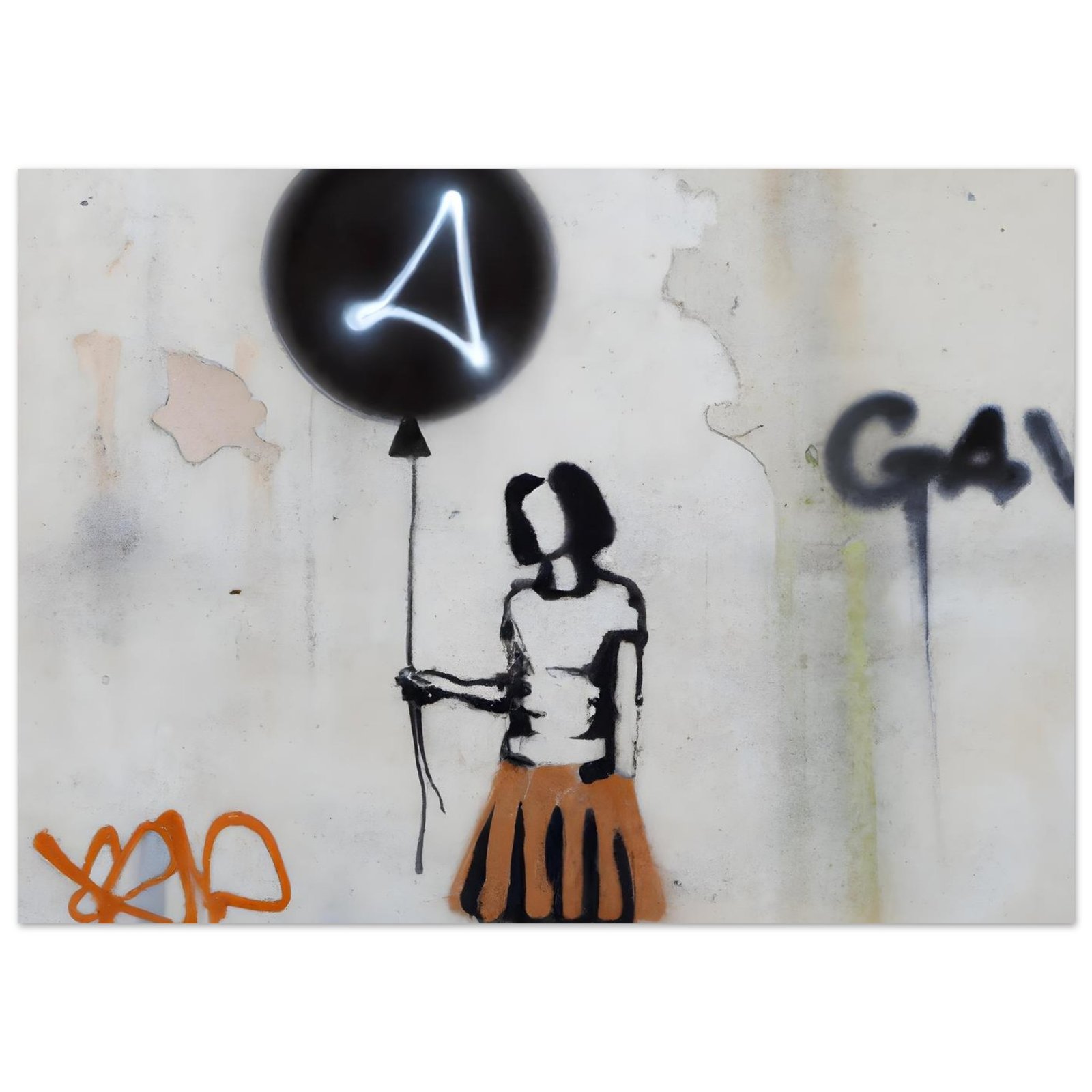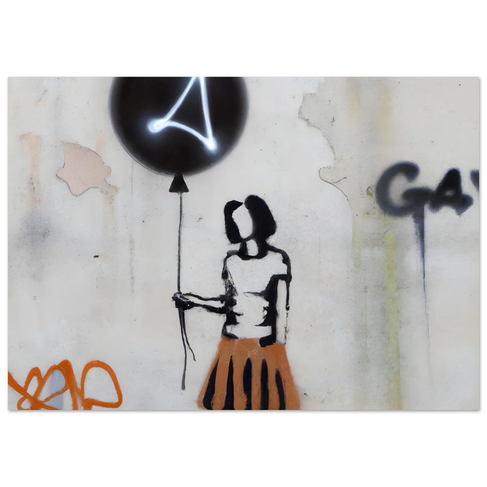 Oczyszczone z detali, wręcz symboliczne przedstawienie postaci podkreśla emocje: niewinność, zagubienie, nadzieję. Neonowy znak na balonie przełamuje klasyczne graffiti i dodaje futurystycznego charakteru. Całość wygląda jak mural przechwycony prosto z miejskiej ulicy.