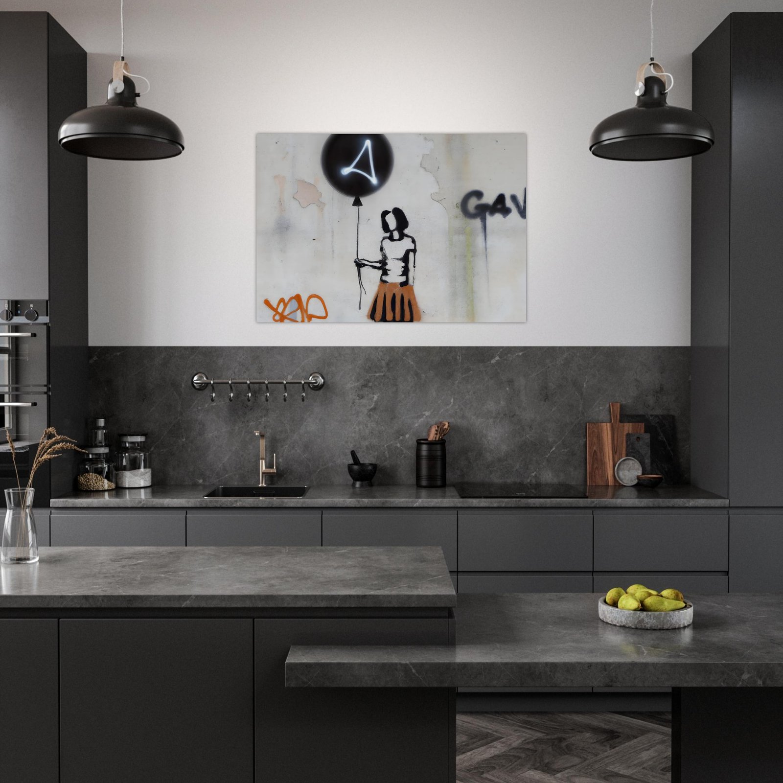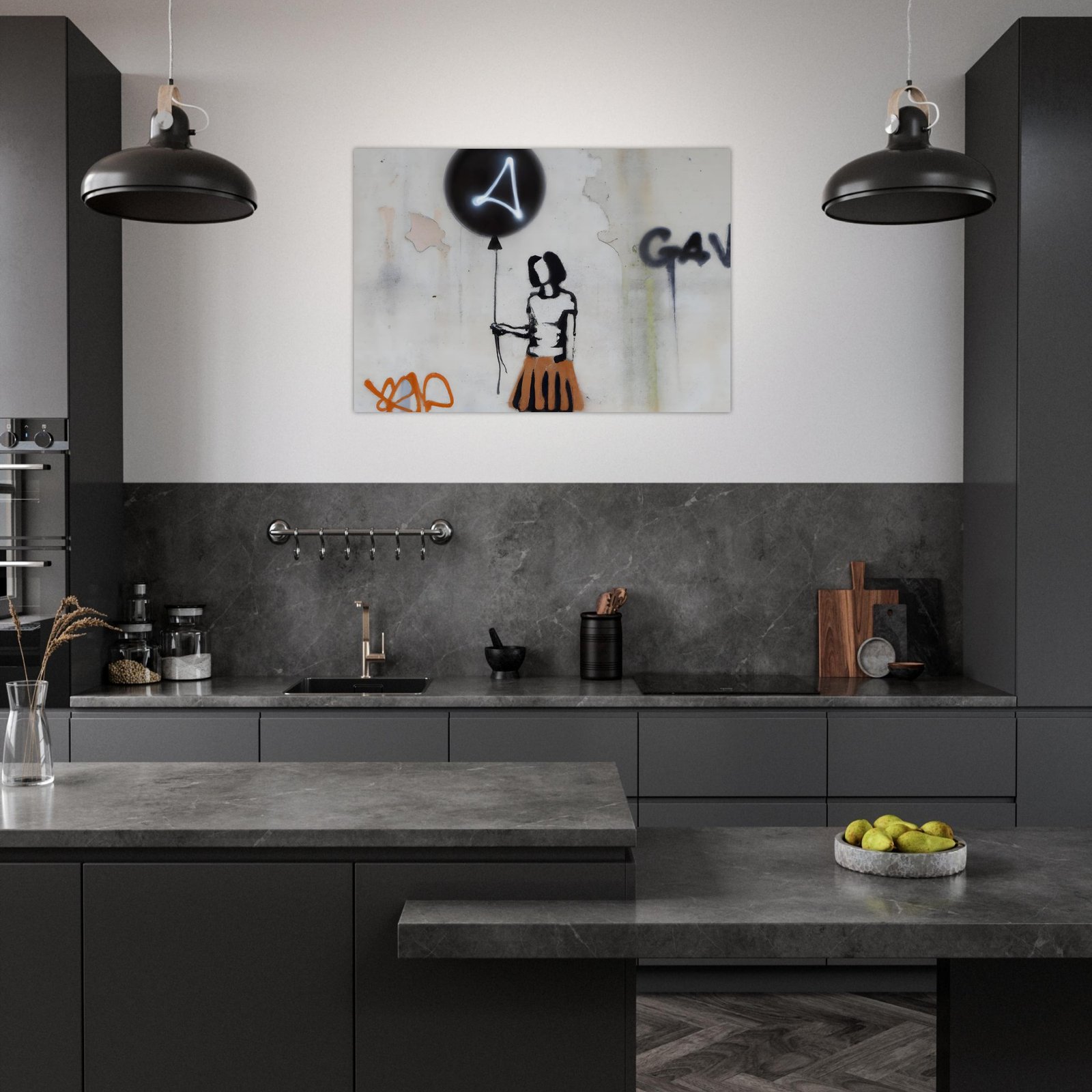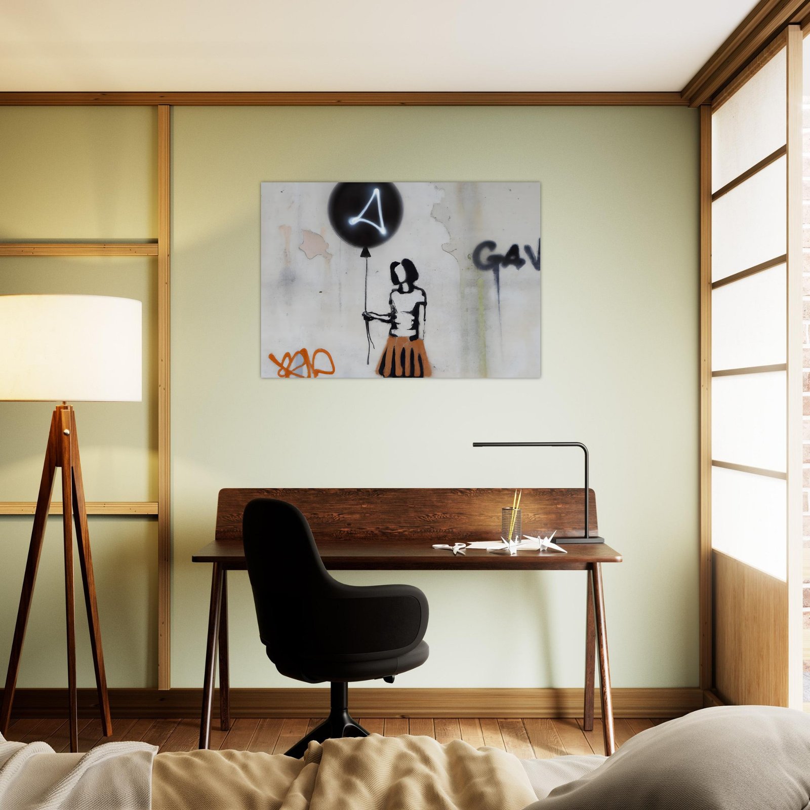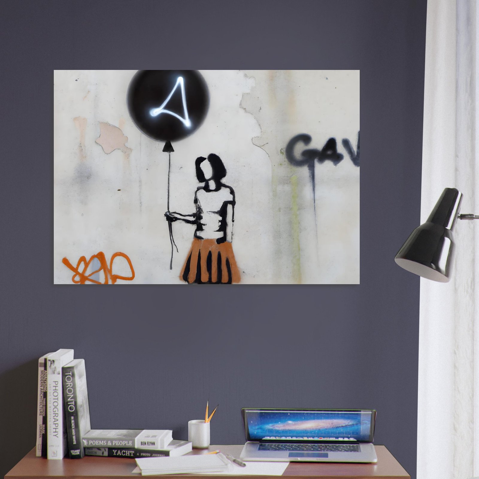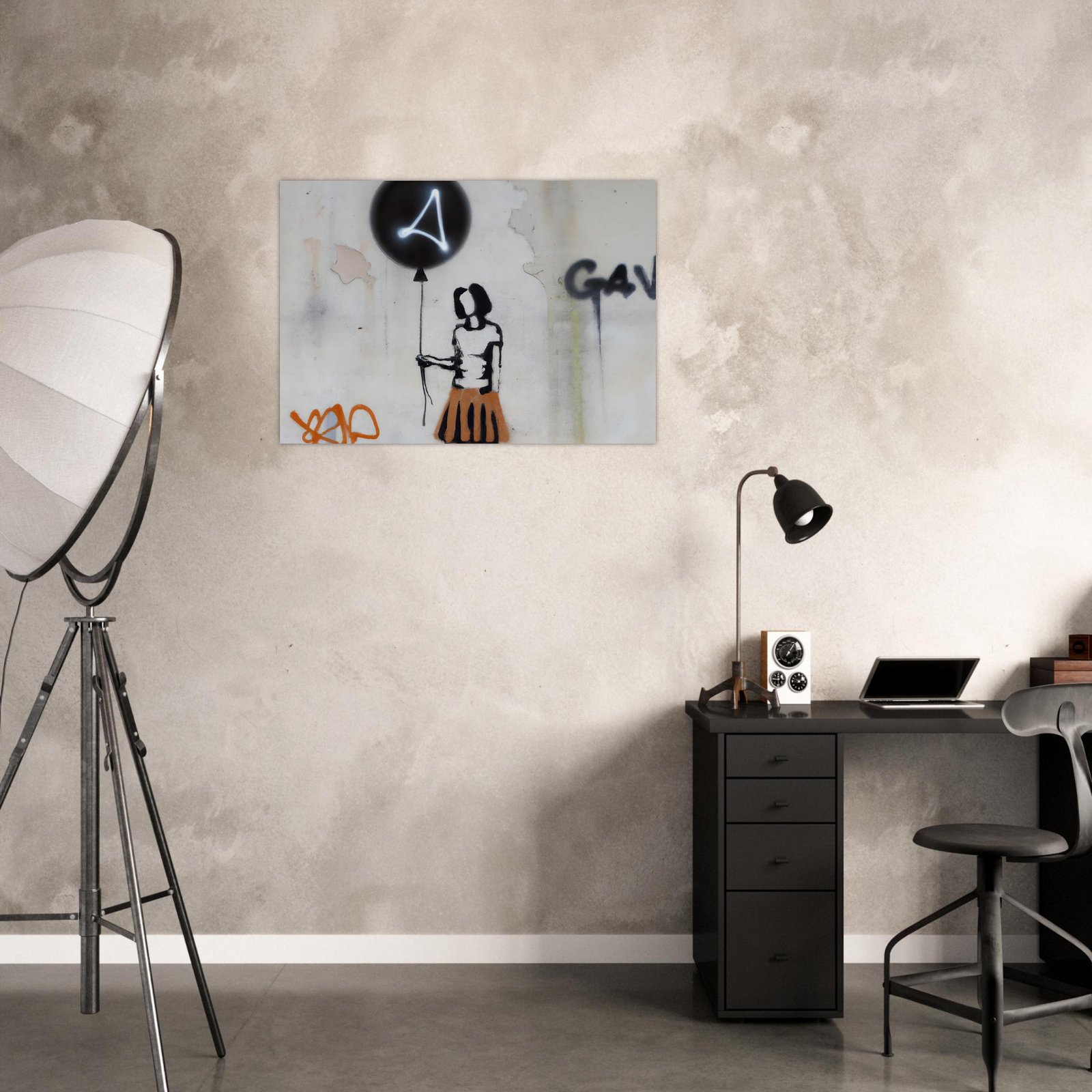 Oczyszczone z detali, wręcz symboliczne przedstawienie postaci podkreśla emocje: niewinność, zagubienie, nadzieję. Neonowy znak na balonie przełamuje klasyczne graffiti i dodaje futurystycznego charakteru. Całość wygląda jak mural przechwycony prosto z miejskiej ulicy.