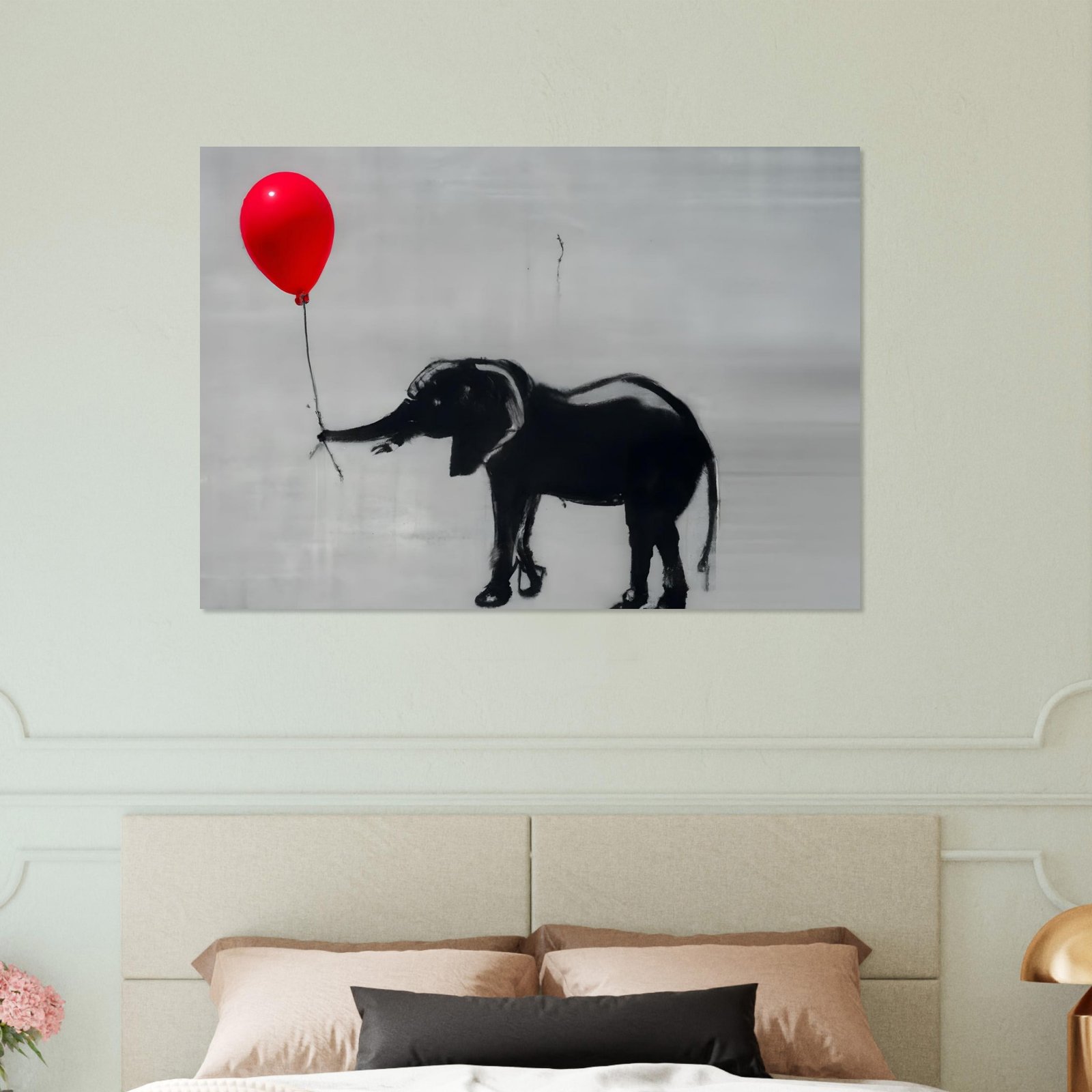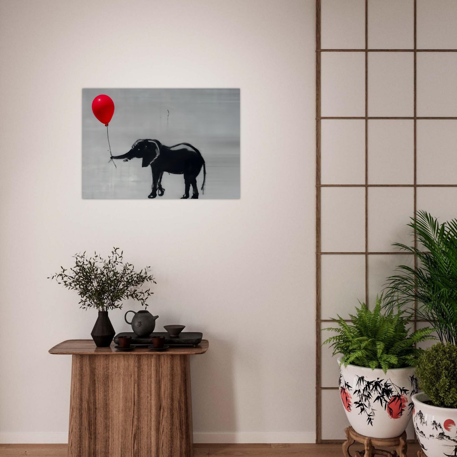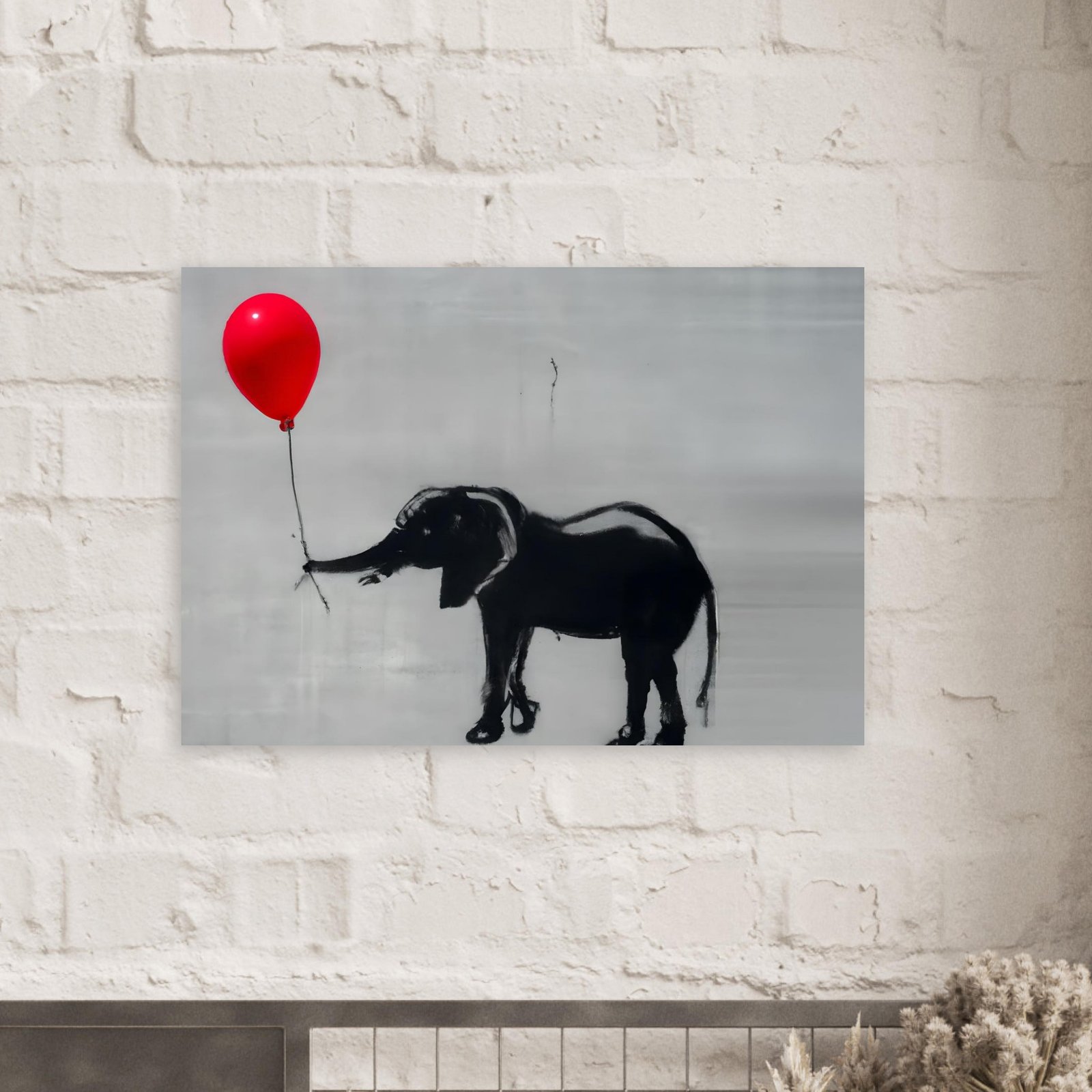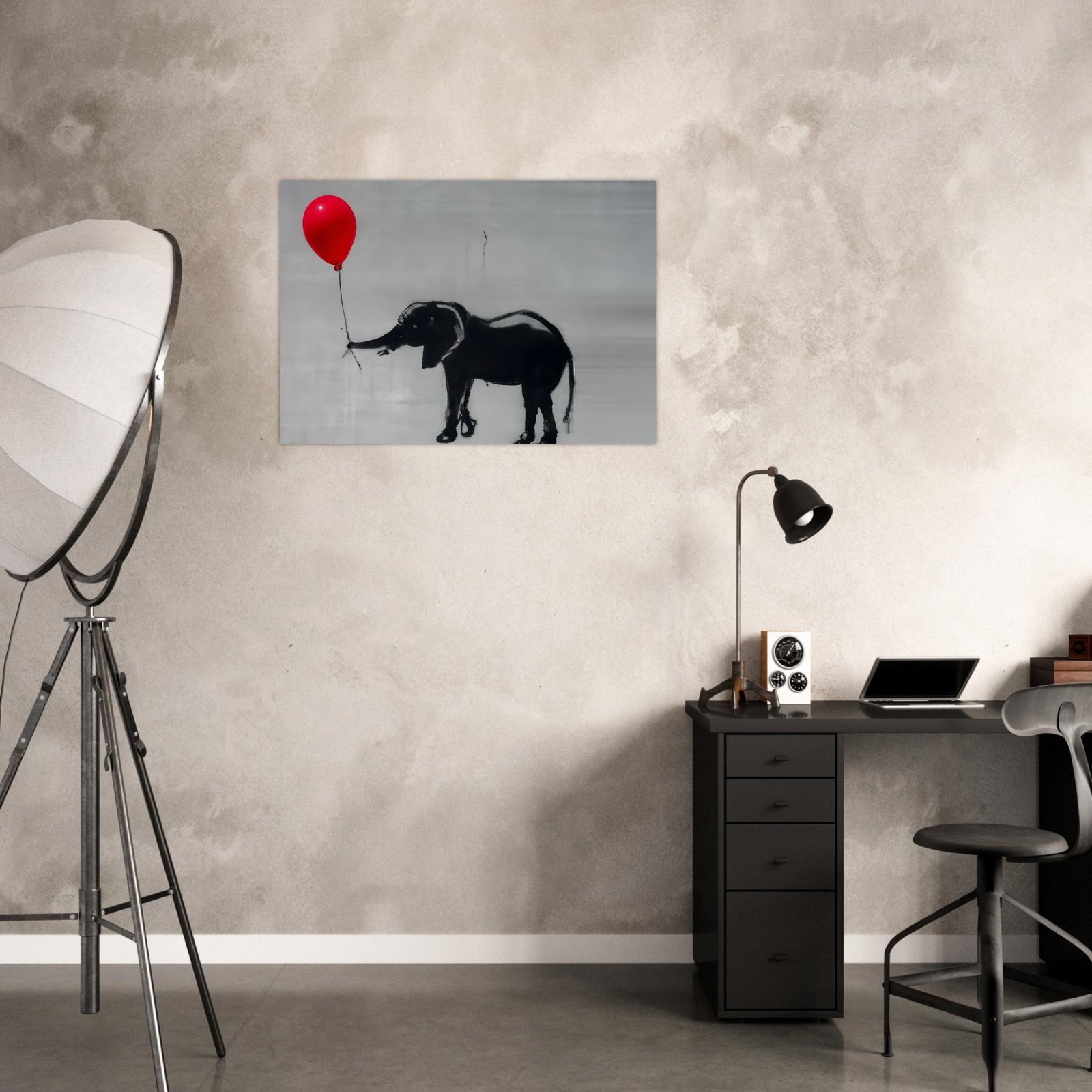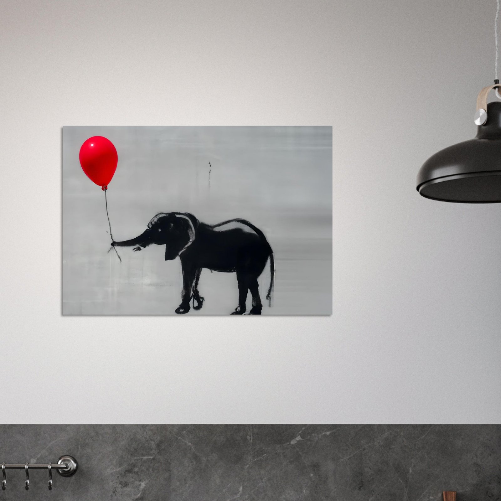 Minimalistyczna forma słonia, wykonana jak klasyczny mural, w połączeniu z intensywną czerwienią balonu tworzy kompozycję, która jest jednocześnie zabawna, symboliczna i głęboko emocjonalna.