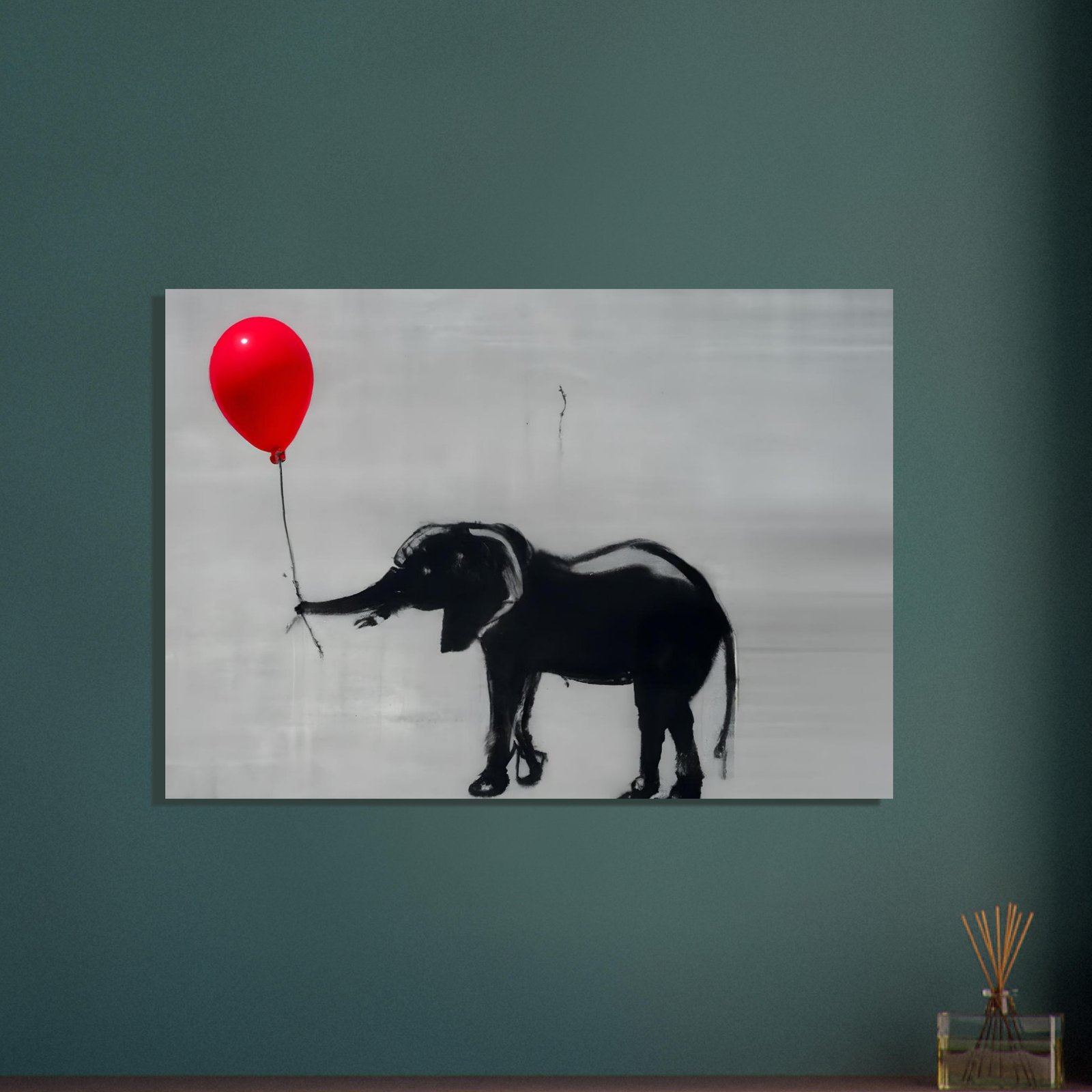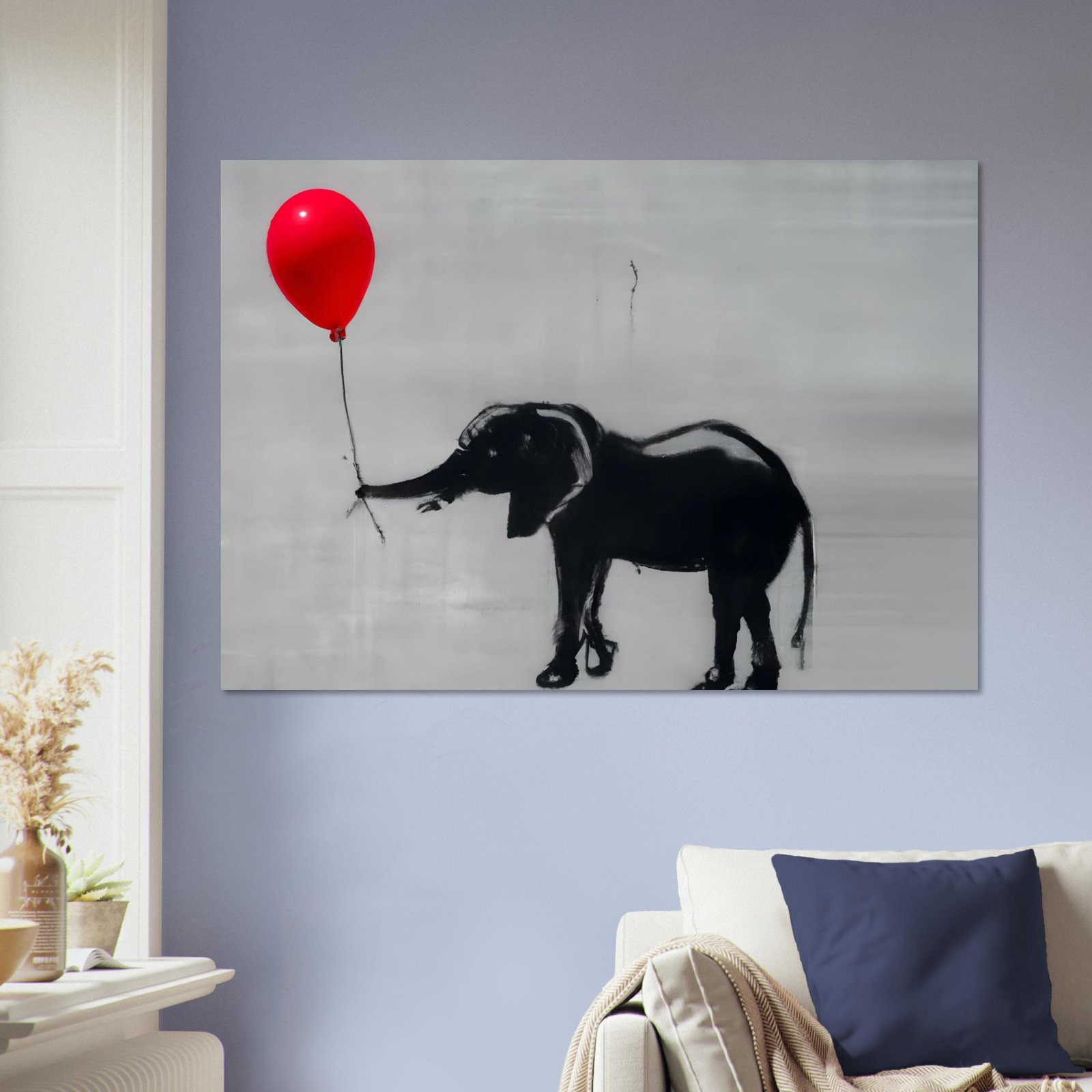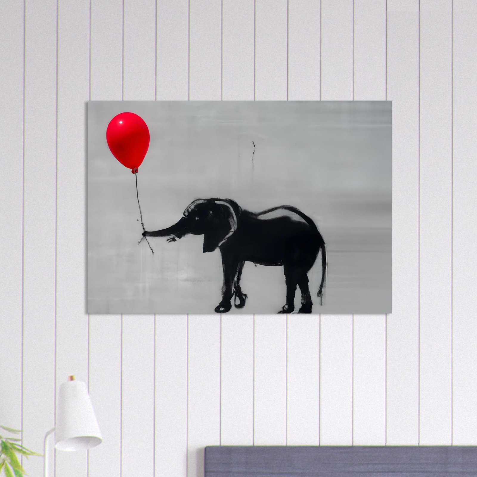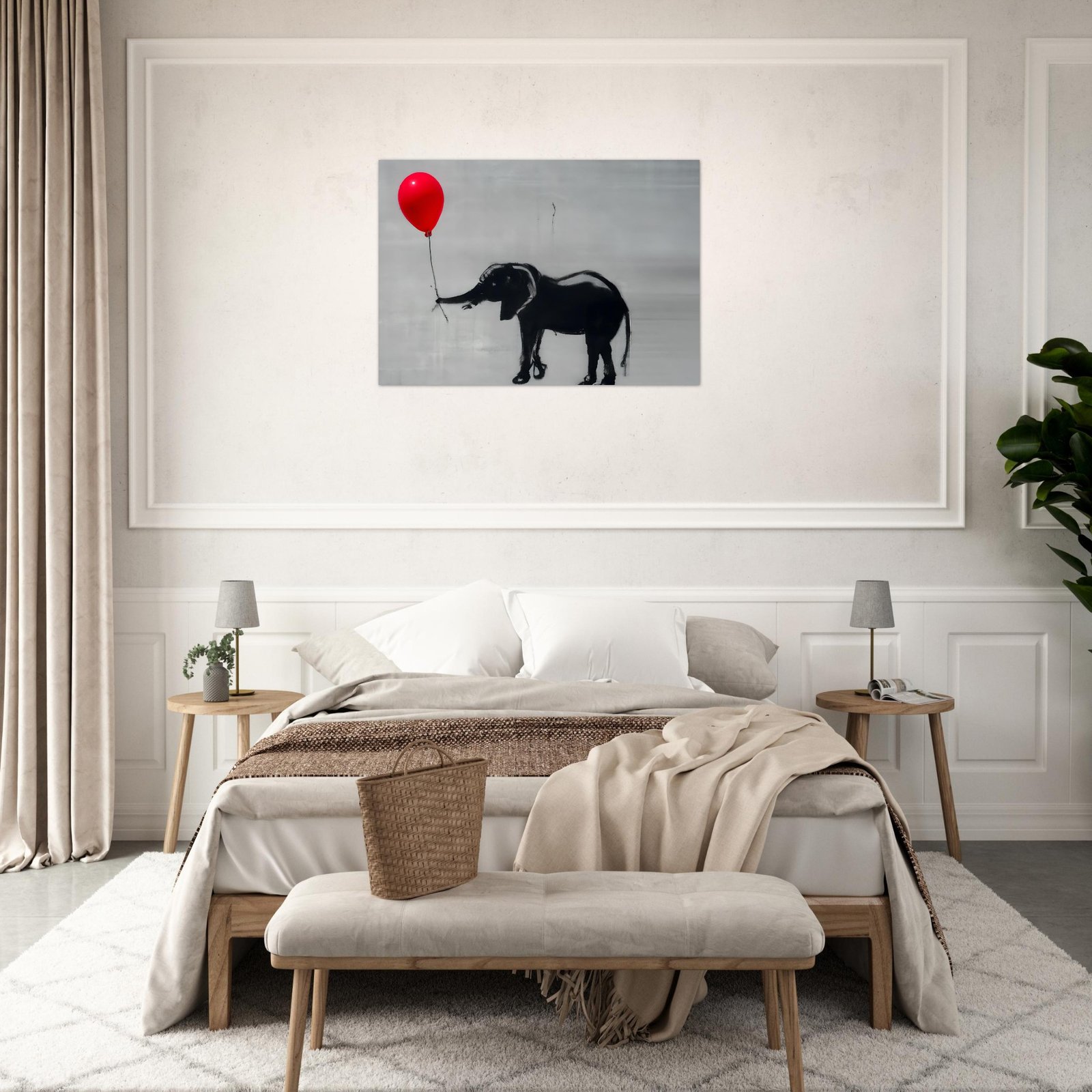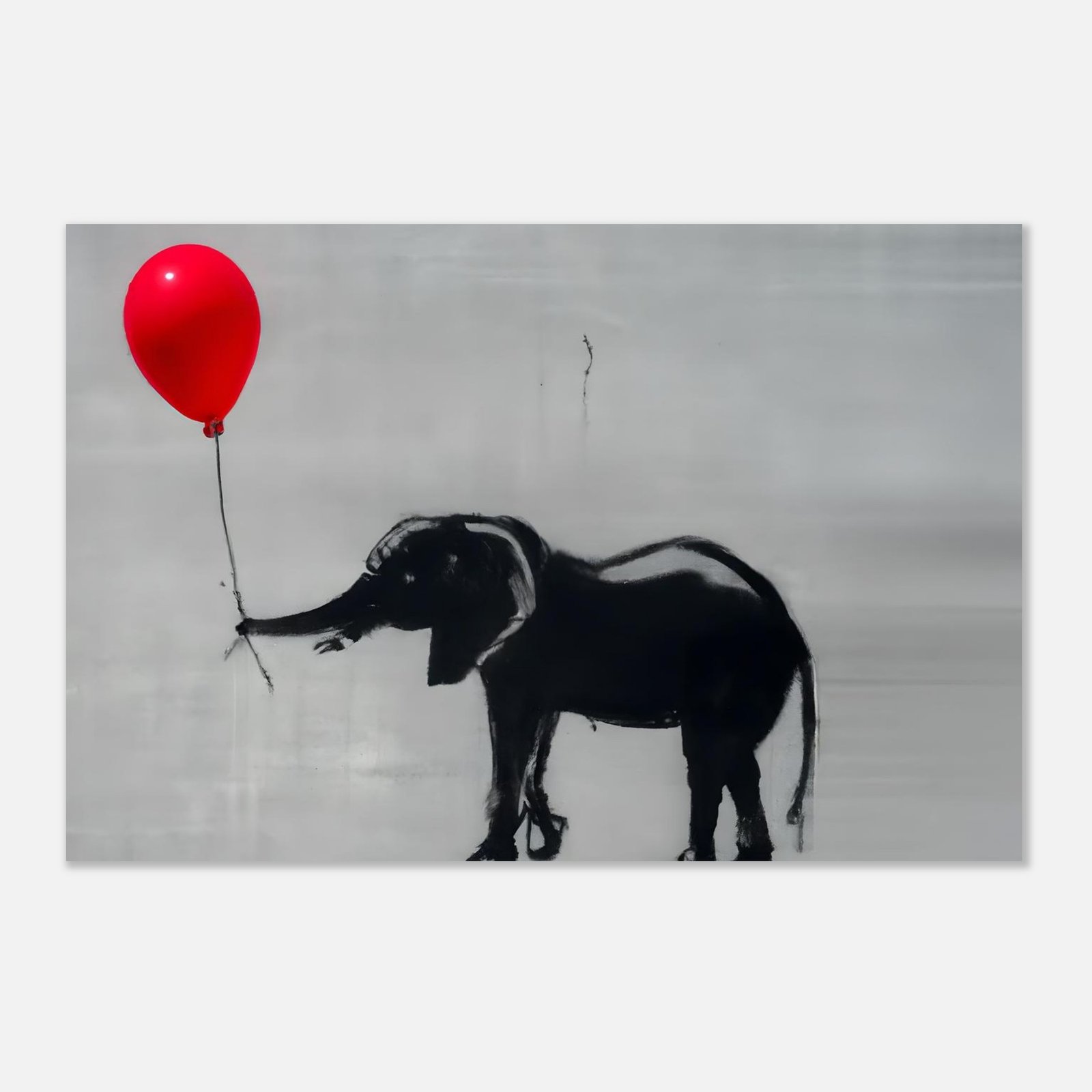 Minimalistyczna forma słonia, wykonana jak klasyczny mural, w połączeniu z intensywną czerwienią balonu tworzy kompozycję, która jest jednocześnie zabawna, symboliczna i głęboko emocjonalna.