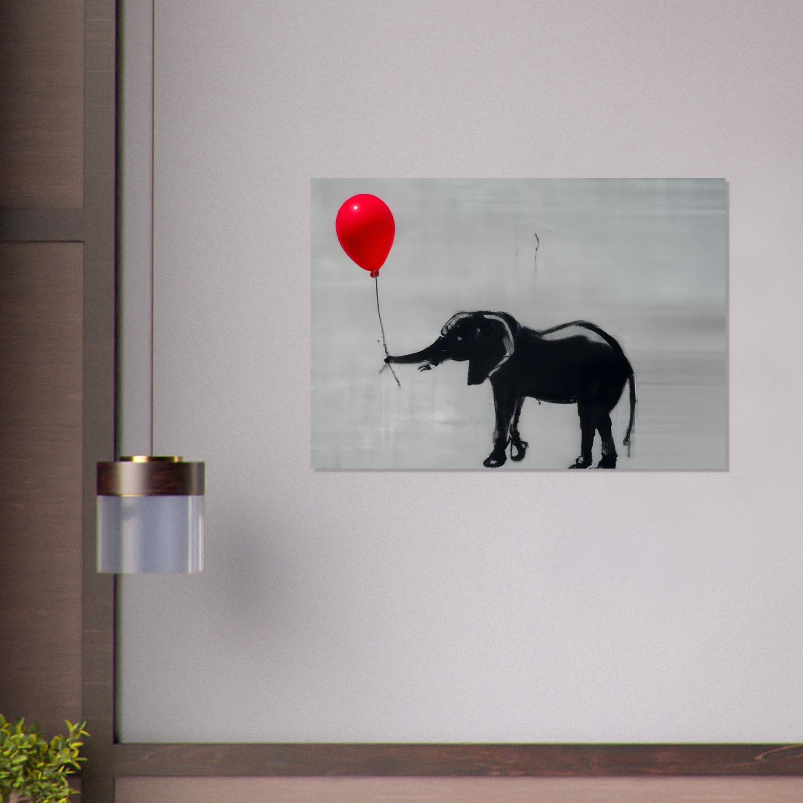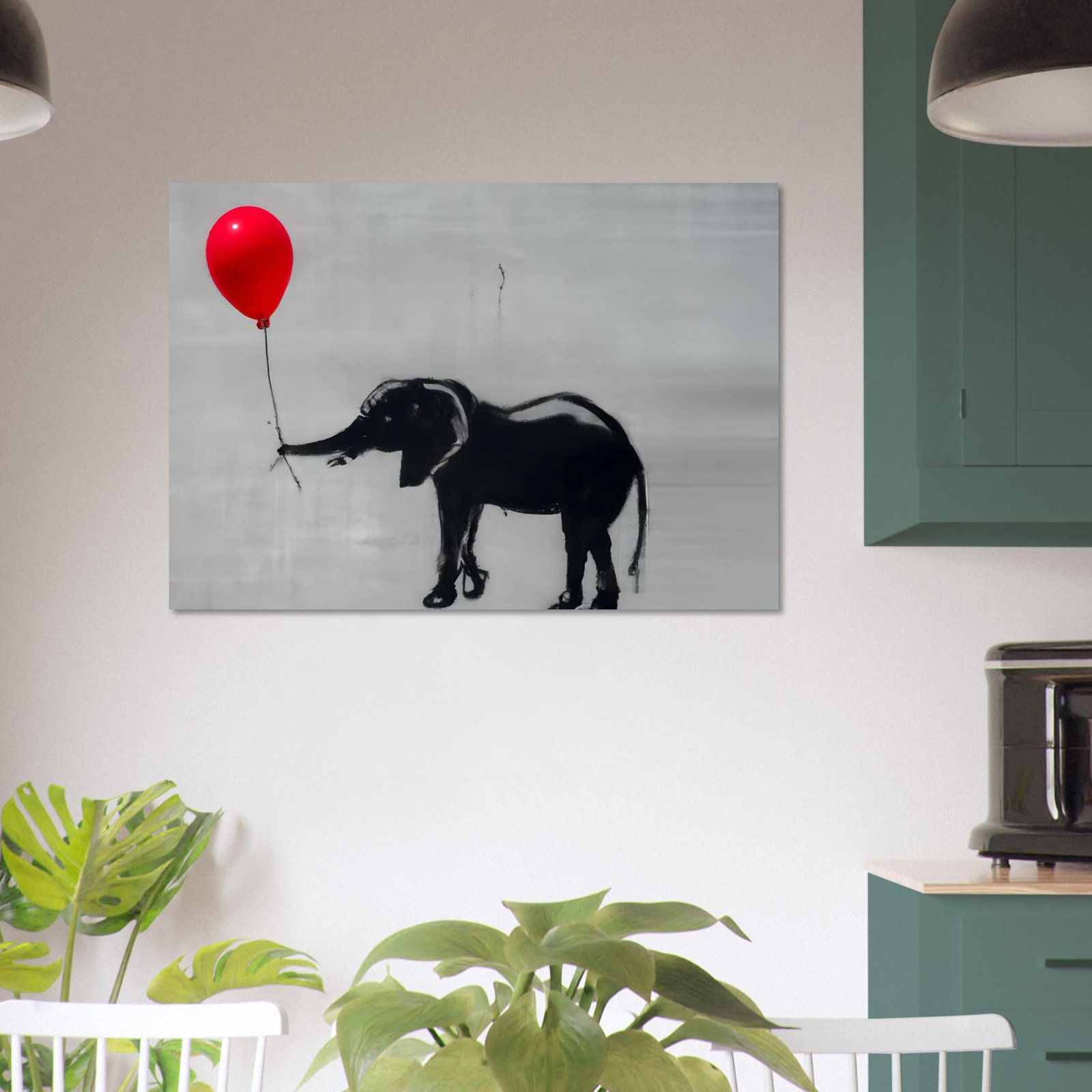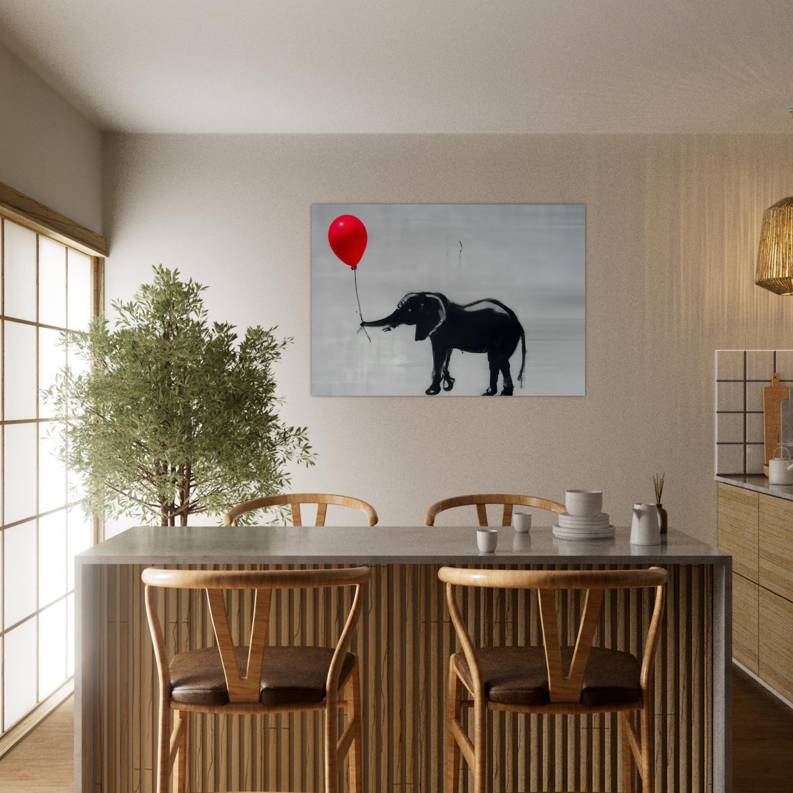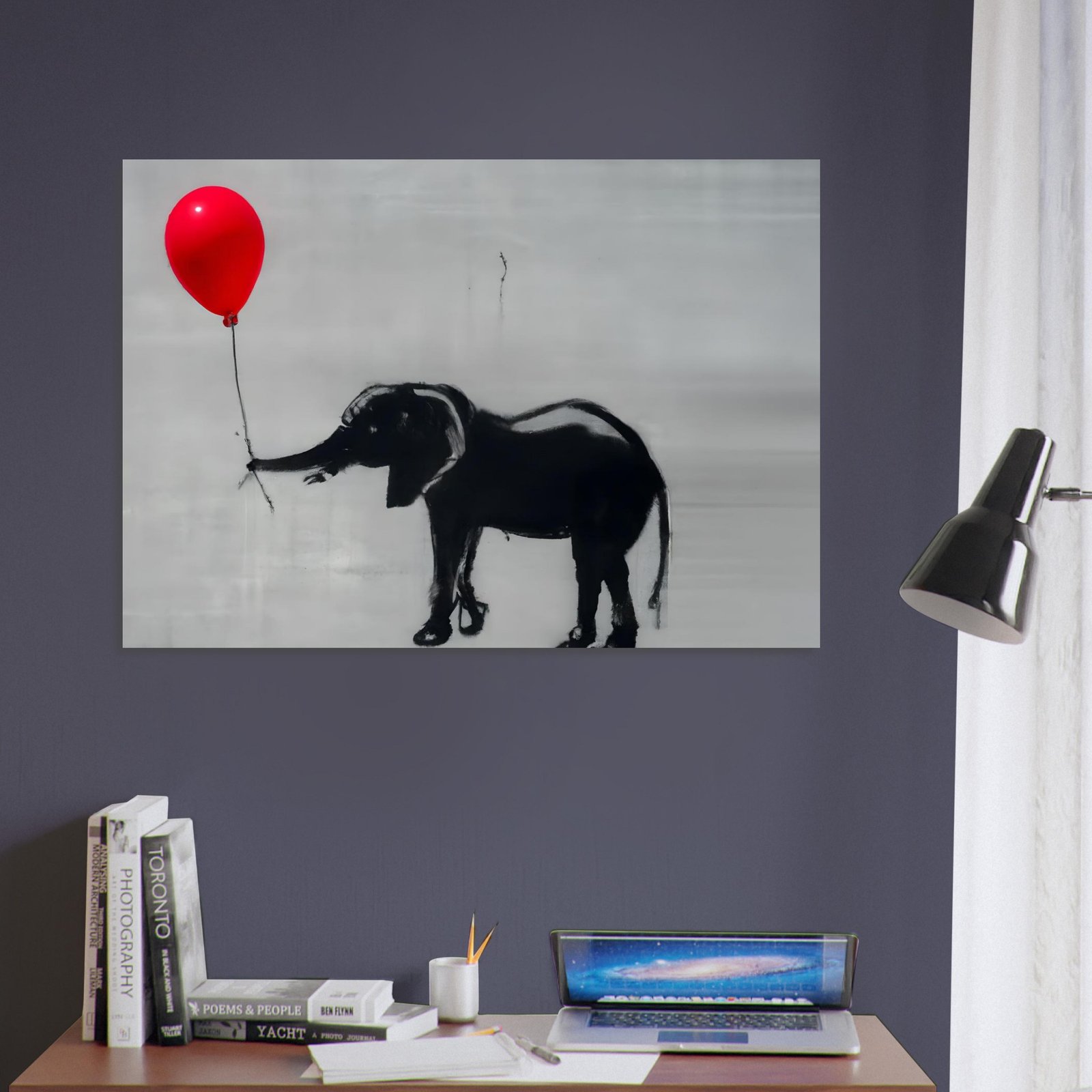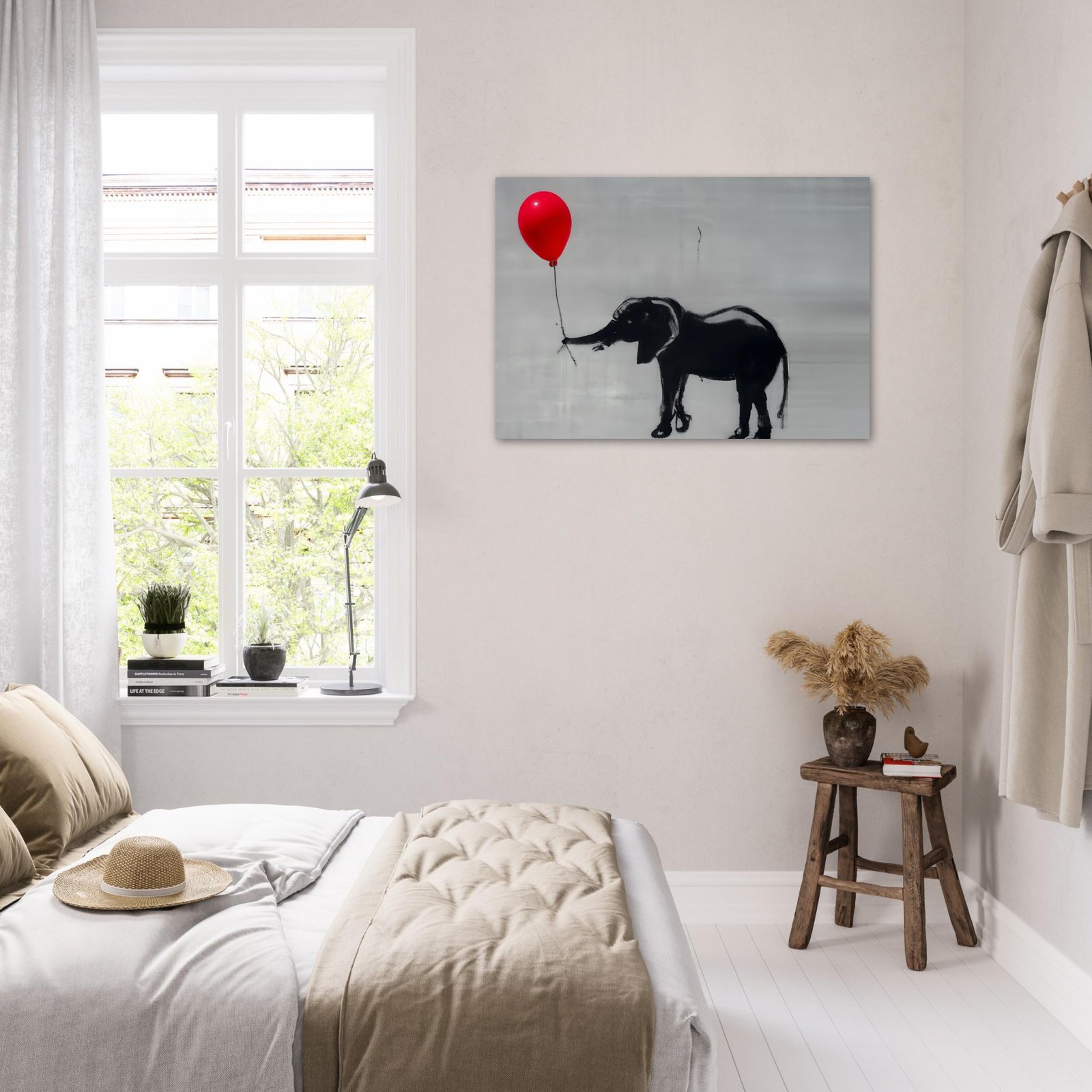 Minimalistyczna forma słonia, wykonana jak klasyczny mural, w połączeniu z intensywną czerwienią balonu tworzy kompozycję, która jest jednocześnie zabawna, symboliczna i głęboko emocjonalna.