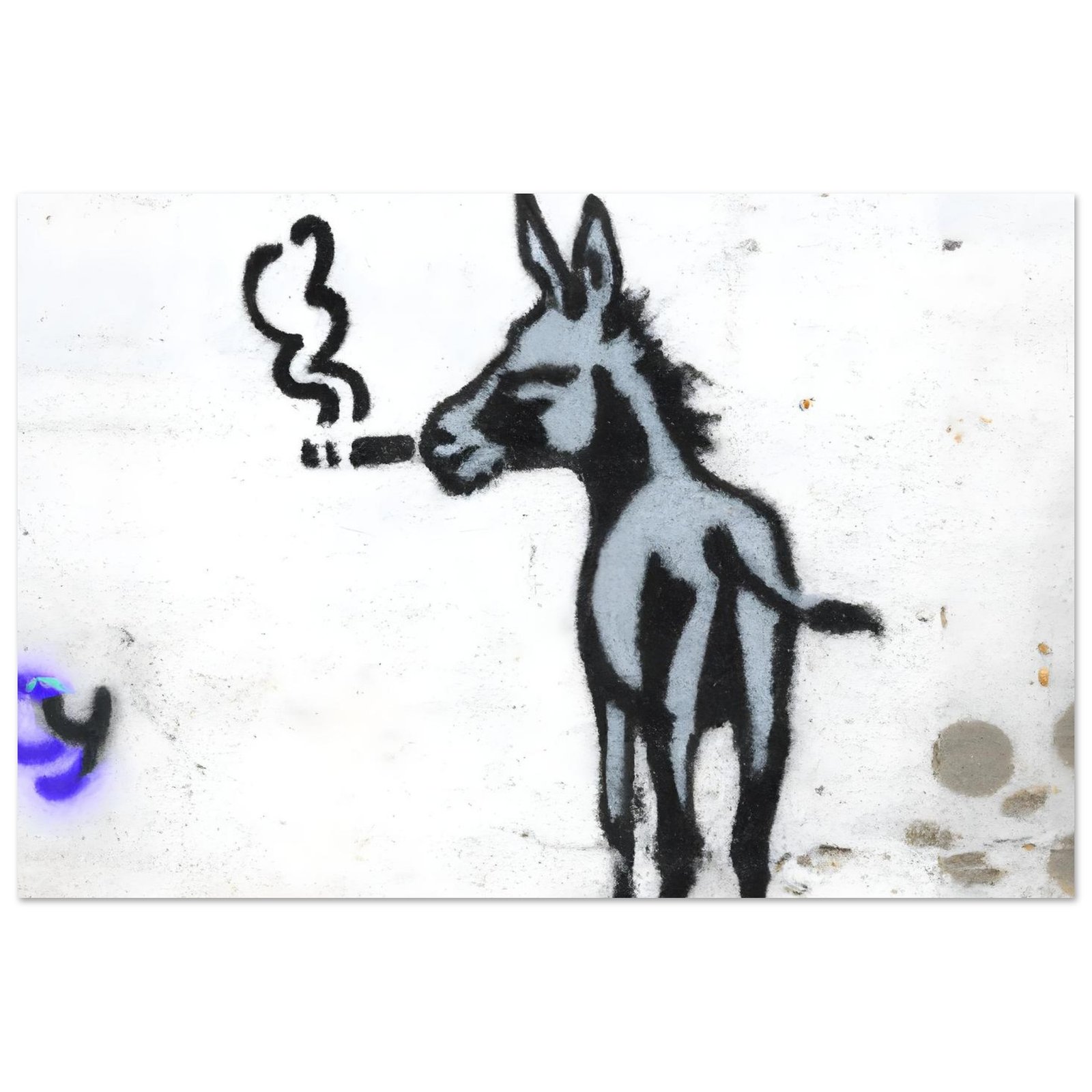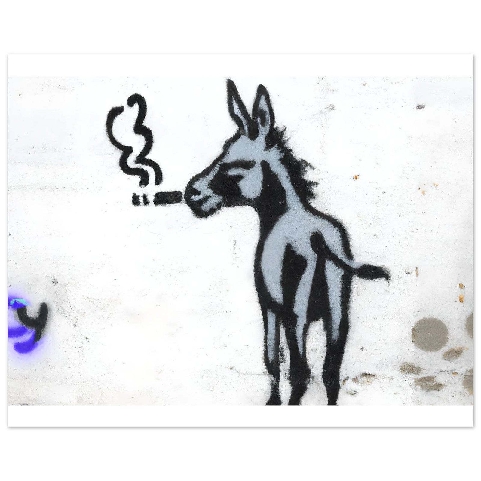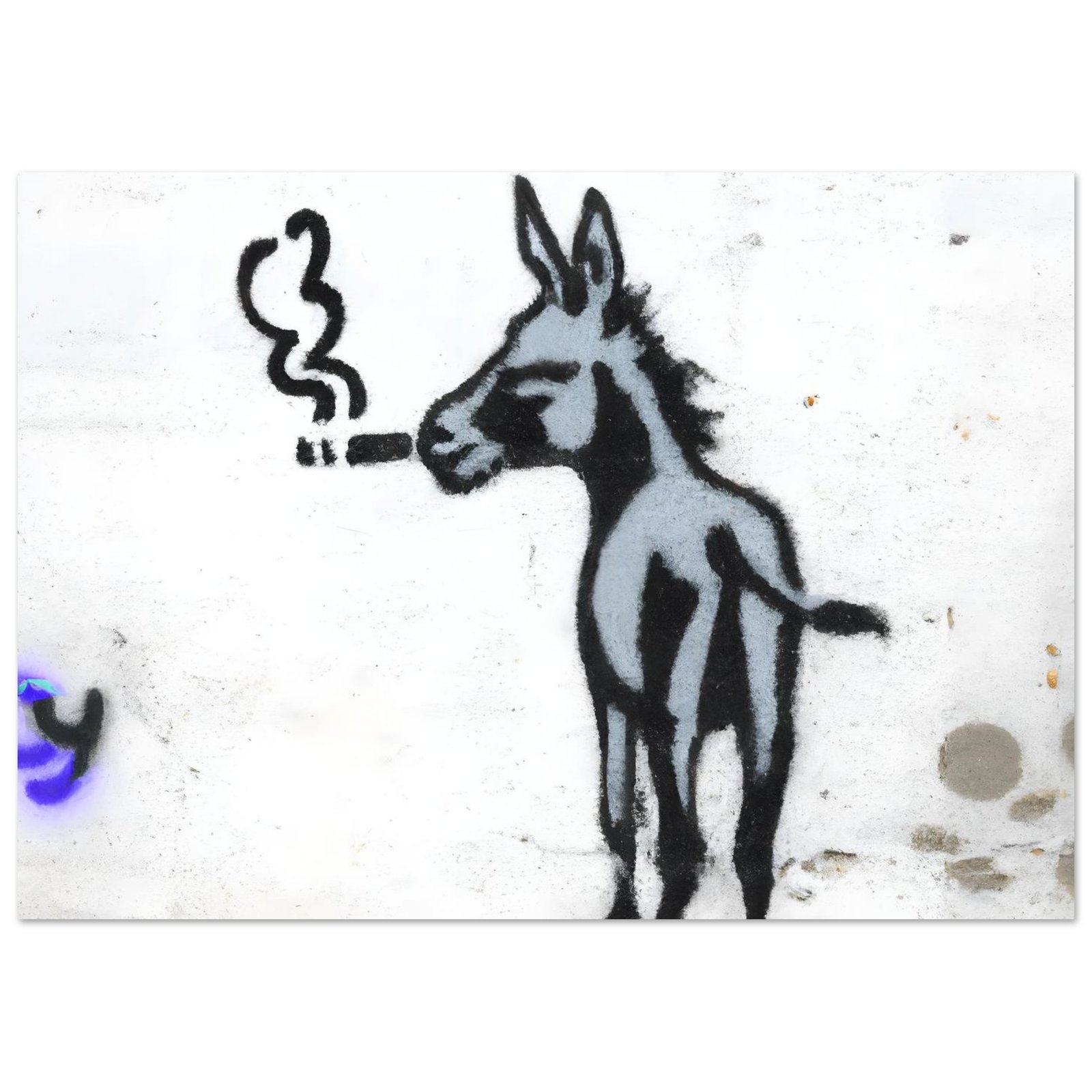 Na ścianie pojawia się coś, czego nikt się nie spodziewa: osiołek… palący papierosa jak gwiazda kina noir. Uchwycony w typowej dla Banksy’ego estetyce — prosty, kontrastowy, a jednak natychmiast przyciągający wzrok.