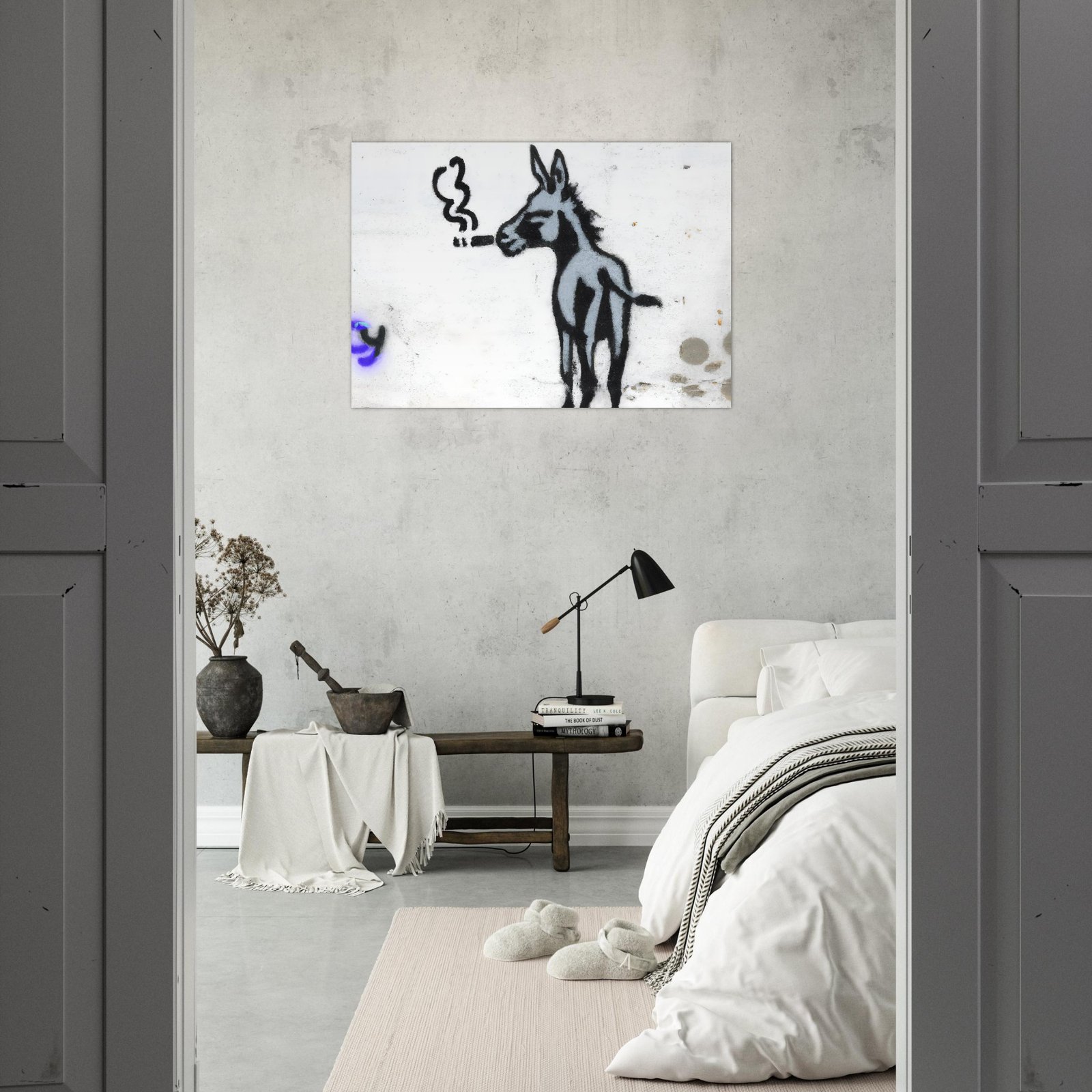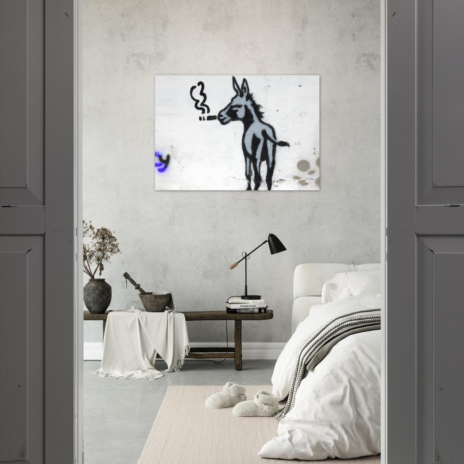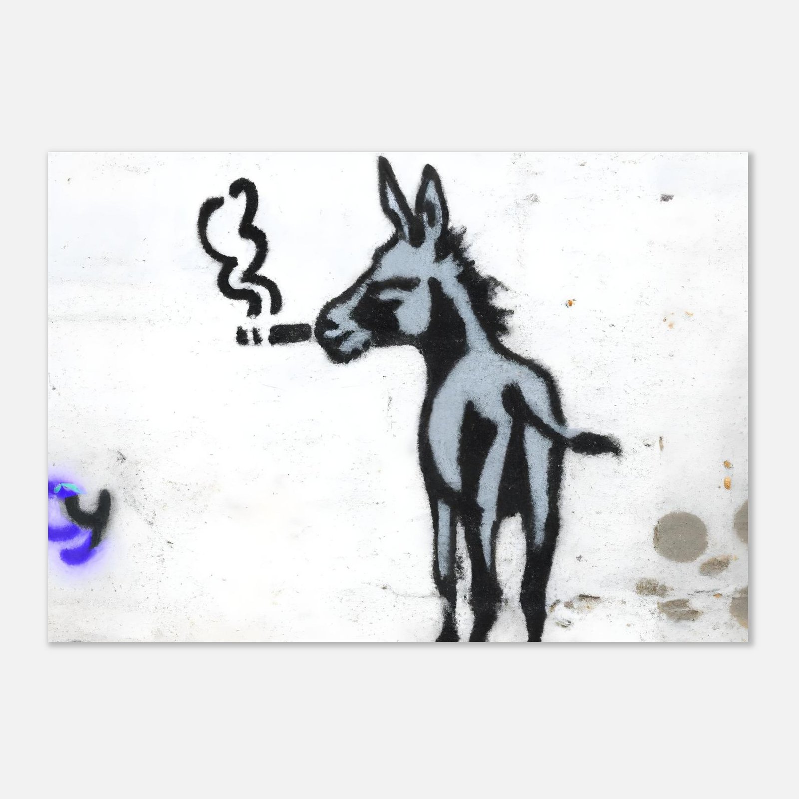 Na ścianie pojawia się coś, czego nikt się nie spodziewa: osiołek… palący papierosa jak gwiazda kina noir. Uchwycony w typowej dla Banksy’ego estetyce — prosty, kontrastowy, a jednak natychmiast przyciągający wzrok.