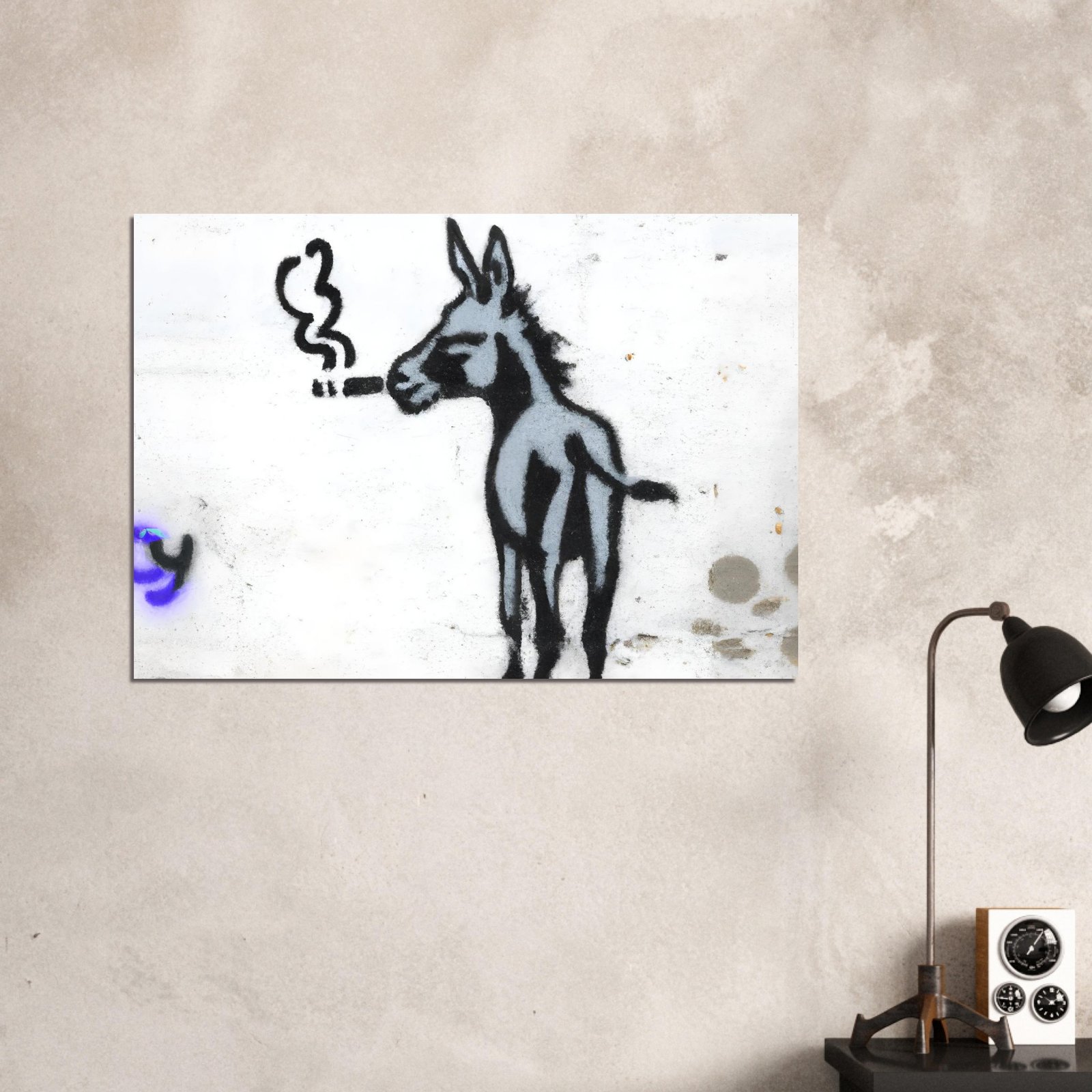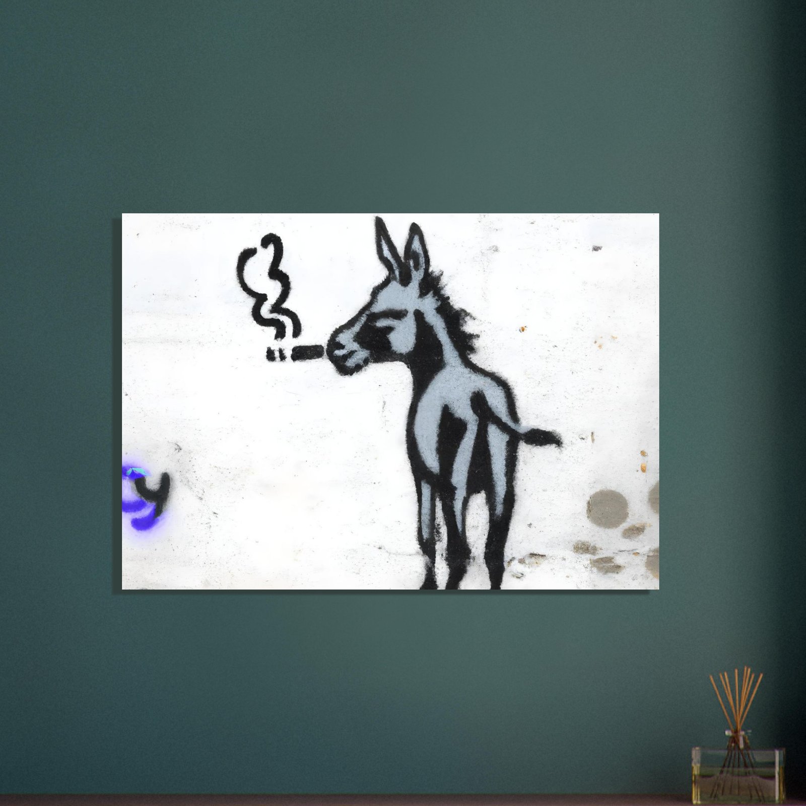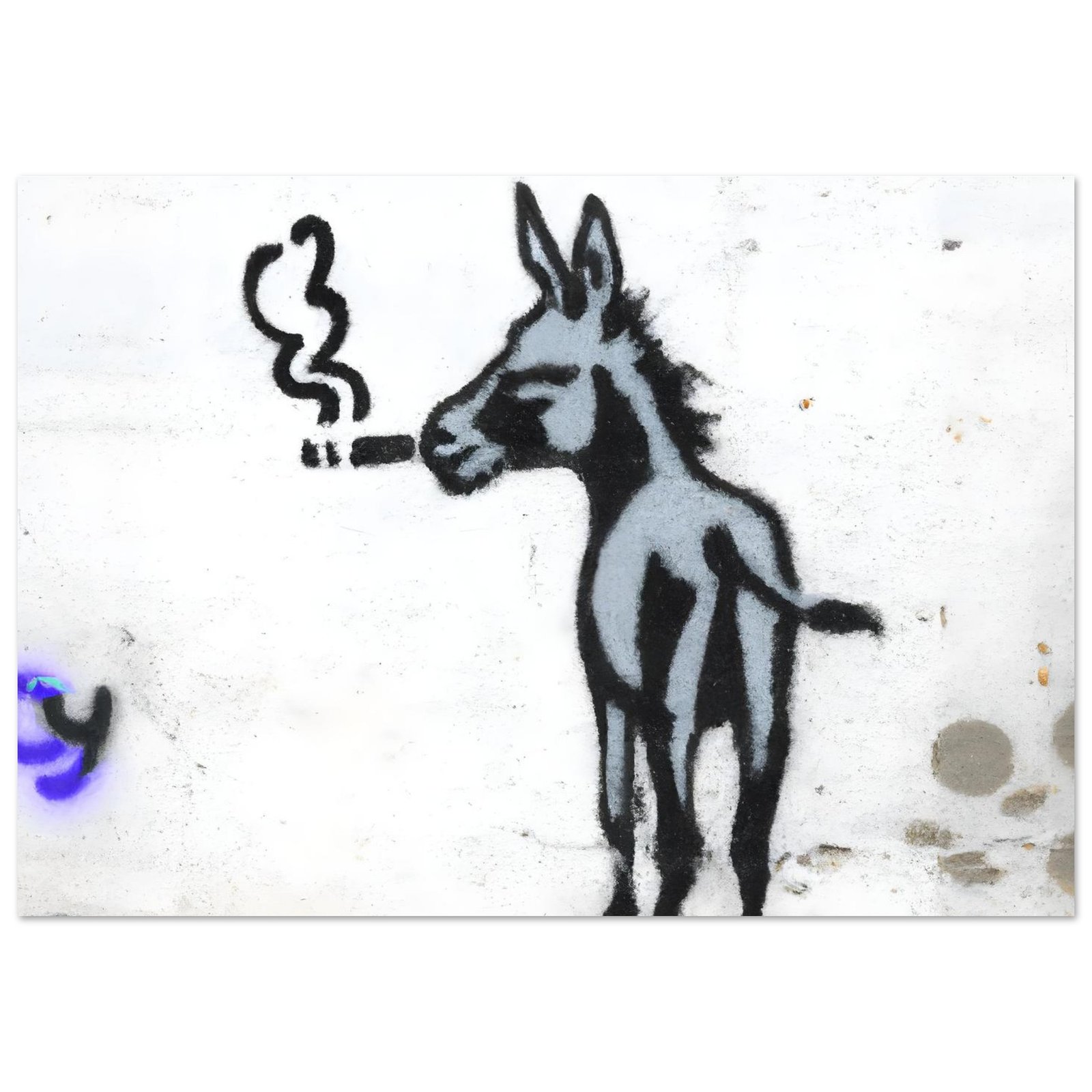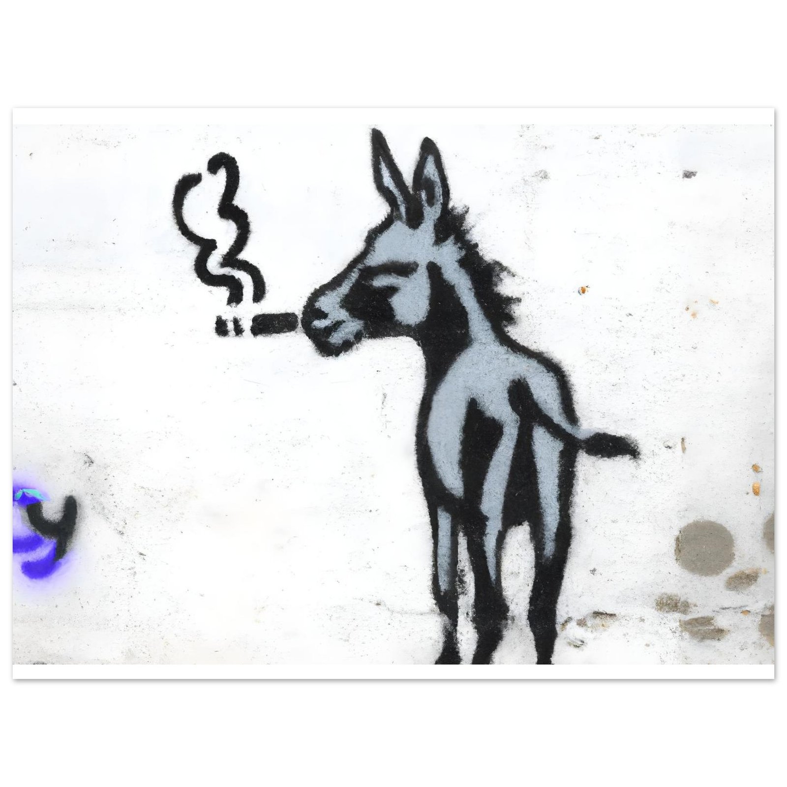 Ta minimalistyczna graffiti-ilustracja łączy ironię, absurd i miejski styl. Osiołek wygląda tak, jakby miał już za sobą długi, ciężki dzień w mieście — i właśnie dlatego jest to obraz, który wywołuje uśmiech, ale i refleksję.