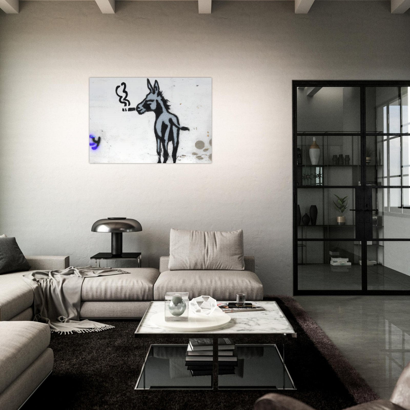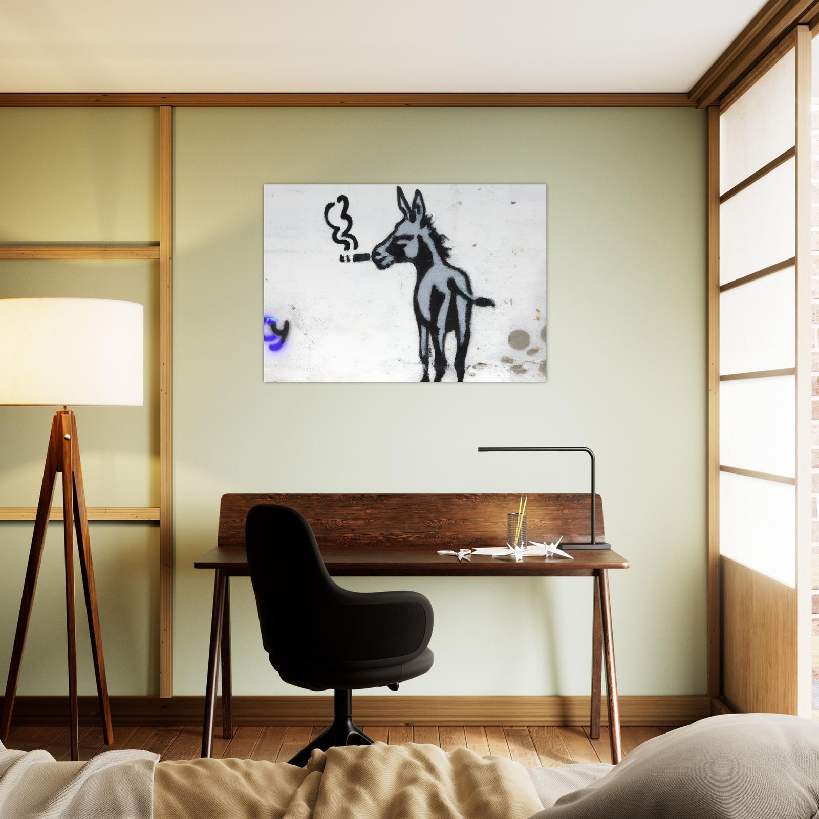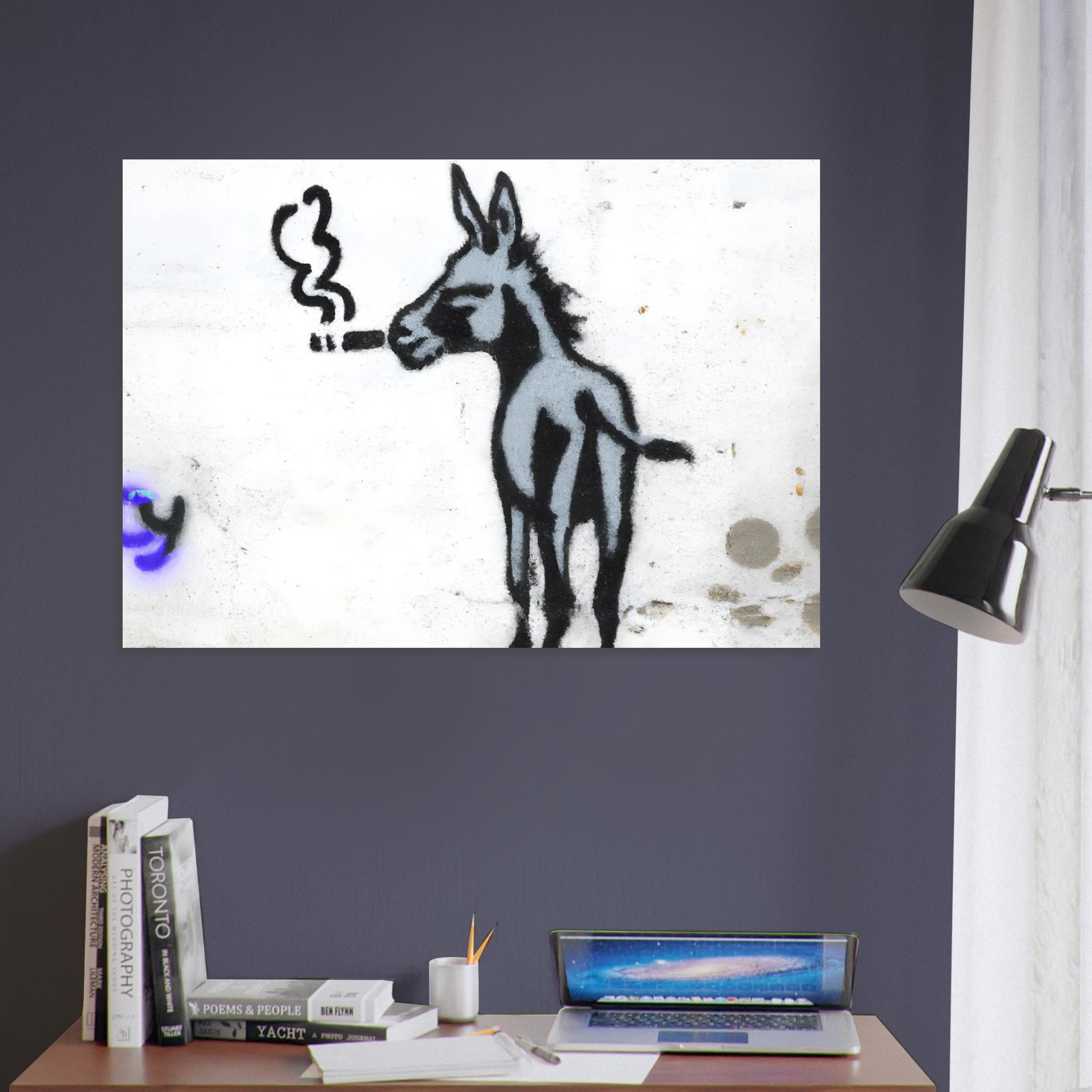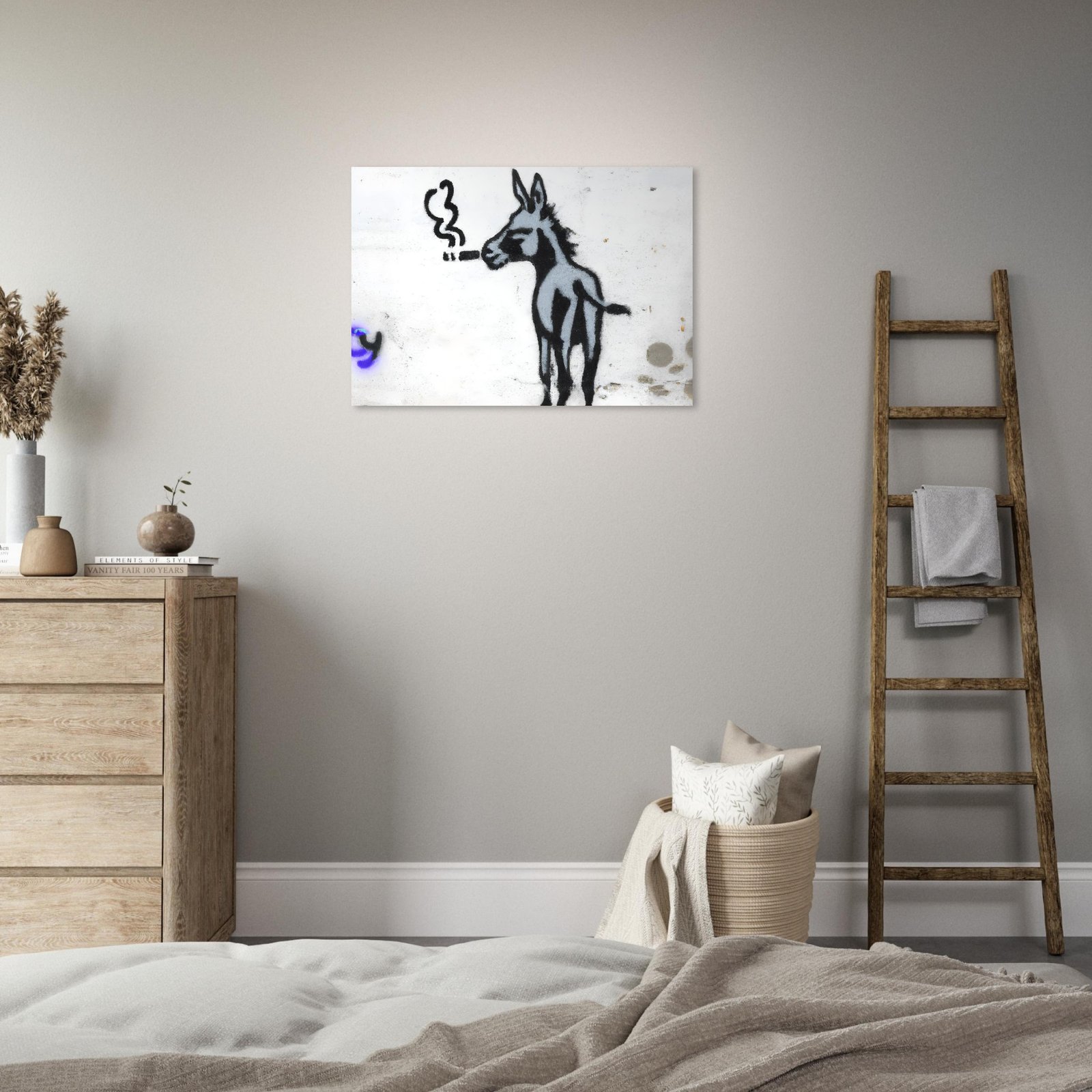 Ta minimalistyczna graffiti-ilustracja łączy ironię, absurd i miejski styl. Osiołek wygląda tak, jakby miał już za sobą długi, ciężki dzień w mieście — i właśnie dlatego jest to obraz, który wywołuje uśmiech, ale i refleksję.