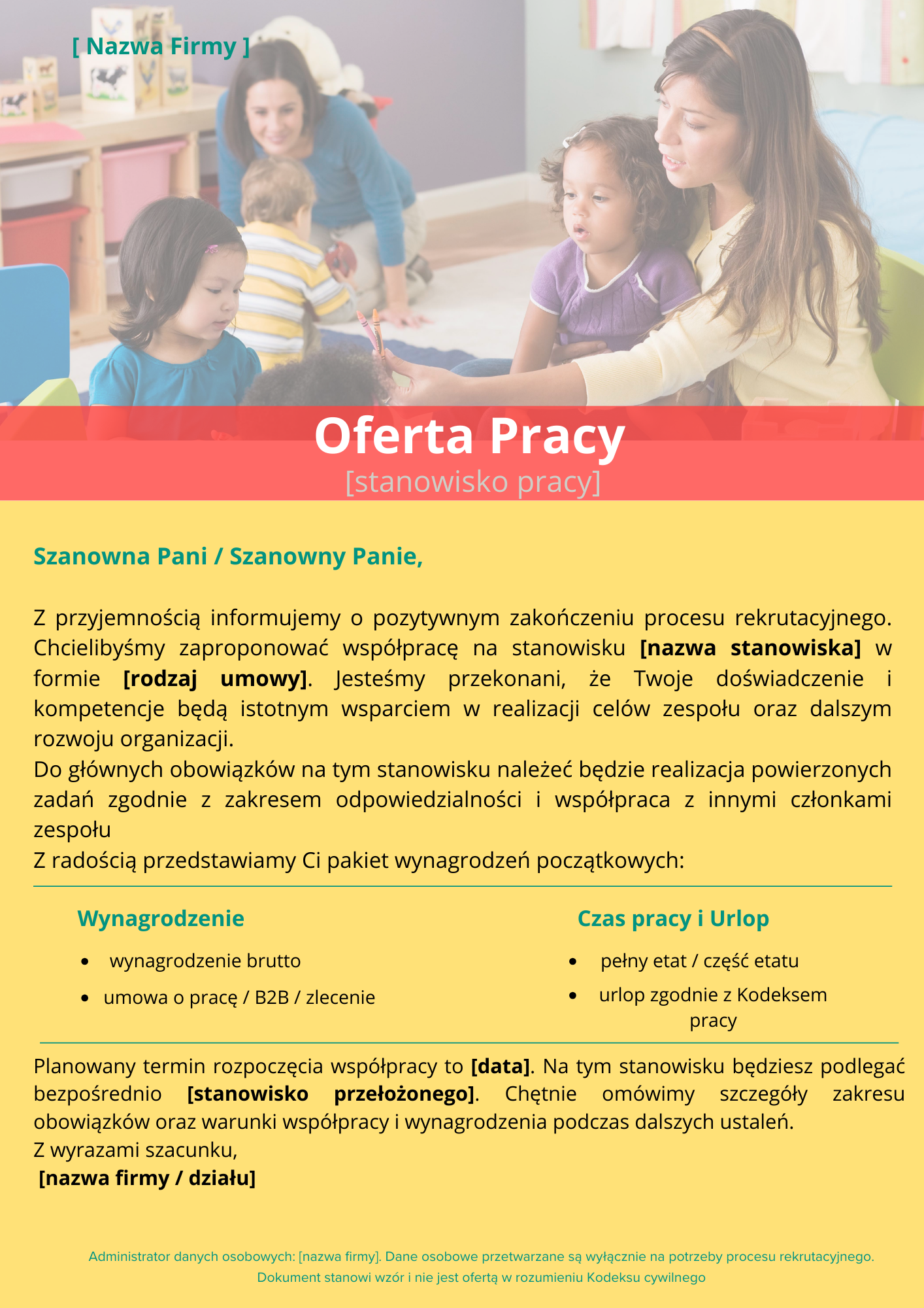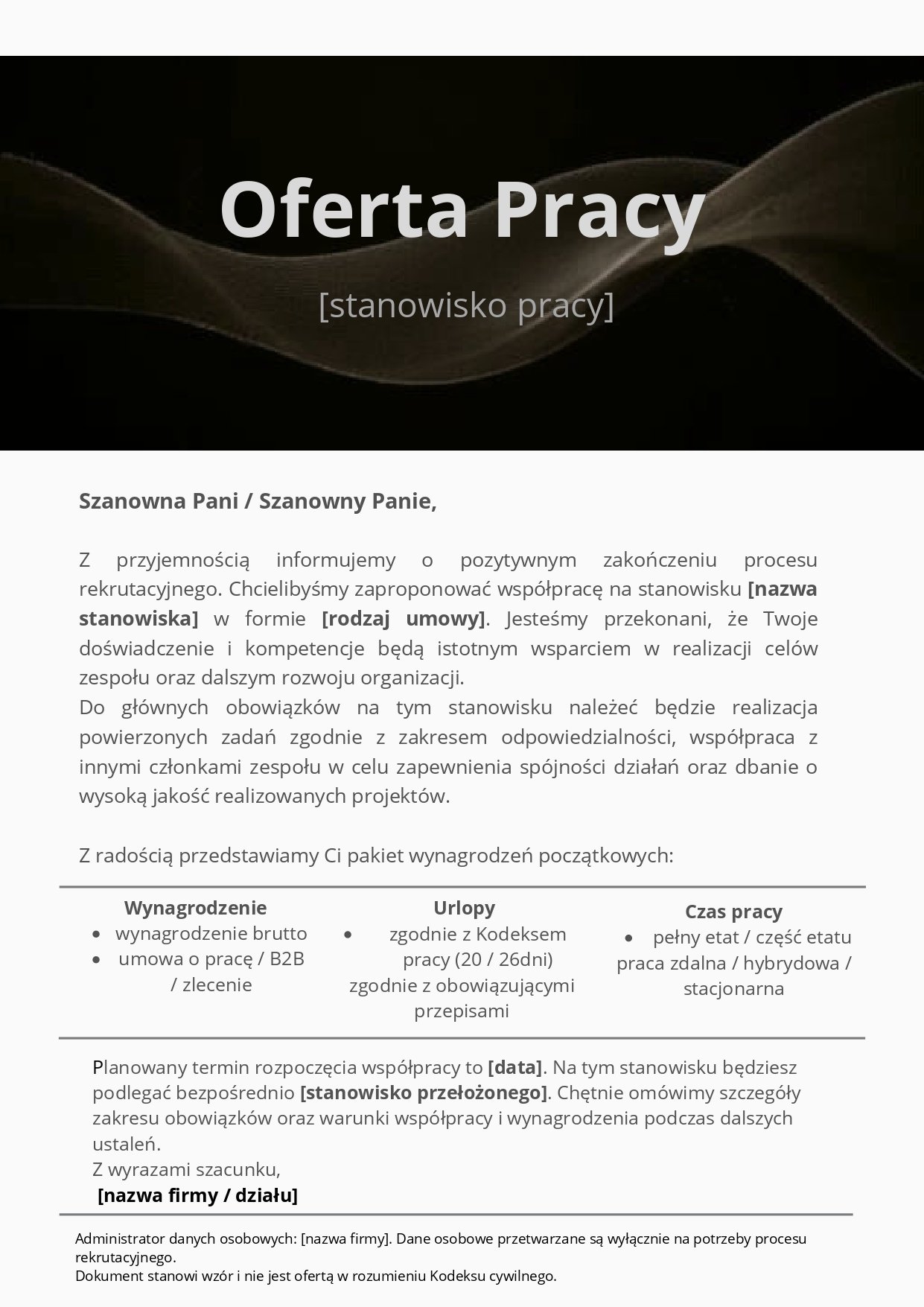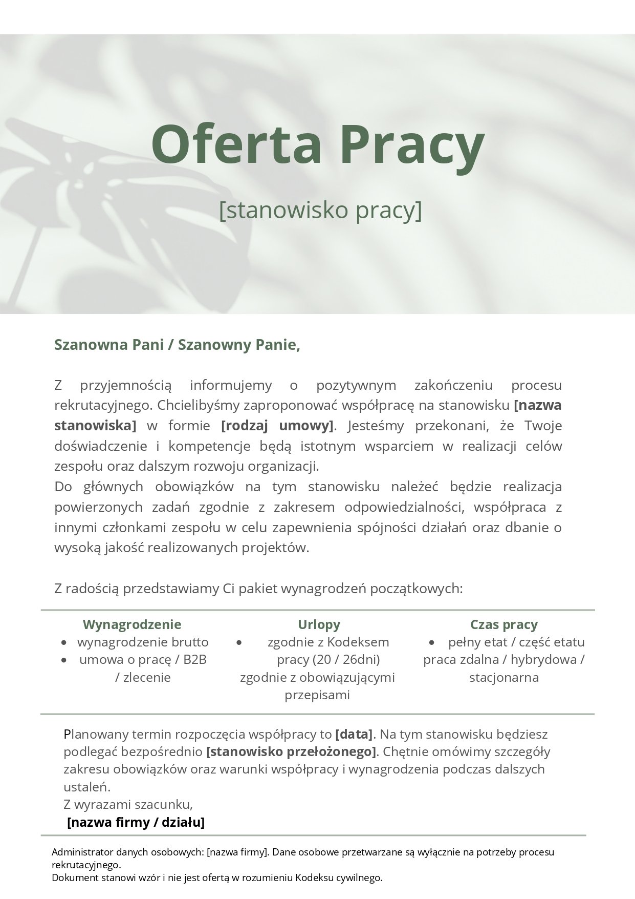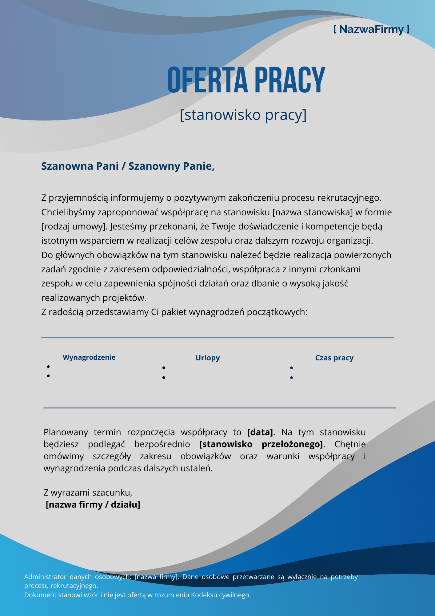 Treść dokumentu ma uniwersalny charakter, dzięki czemu sprawdzi się zarówno w rekrutacjach na stanowiska specjalistyczne, menedżerskie, jak i operacyjne. Zawiera m.in. miejsce na nazwę stanowiska, rodzaj umowy, zakres obowiązków, warunki współpracy, pakiet wynagrodzeń oraz klauzulę informacyjną.